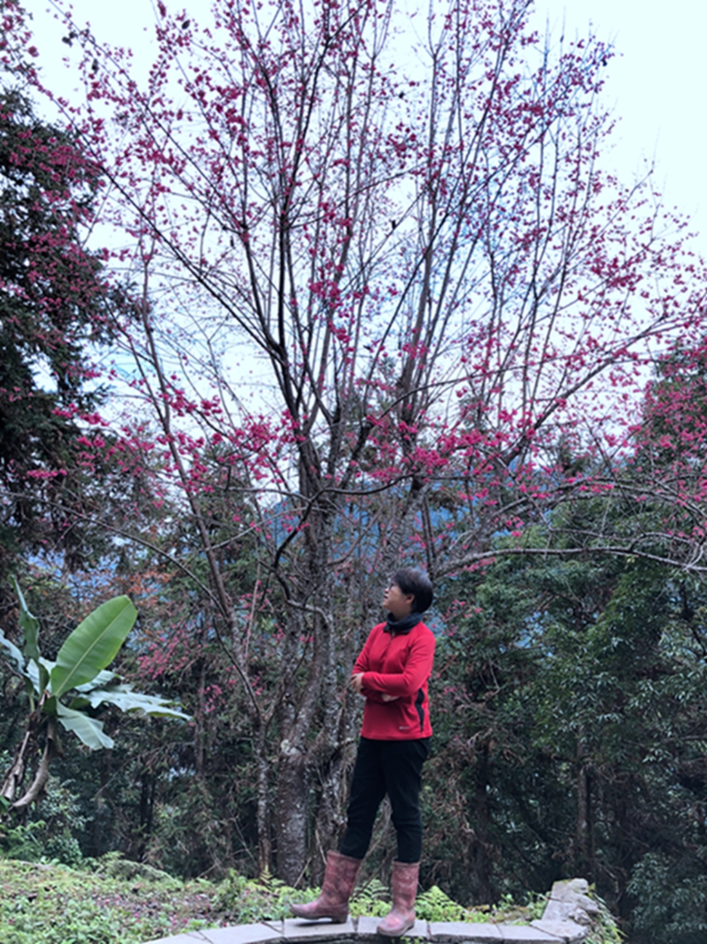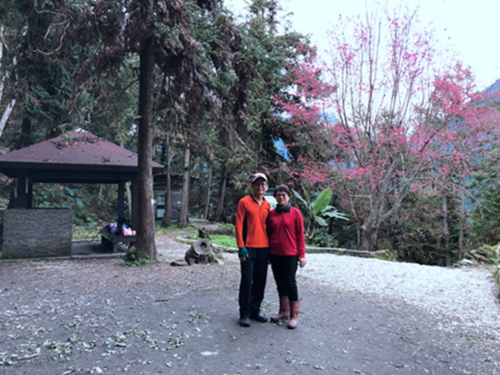 16:10~16:30回佳心駐在所,回程遇十幾個山友重裝要上去瓦拉米夜宿;停下來小休吃燒餅,平台上有一個女山友在收帳篷正準備離去,這裡有訊號打了幾通電話,休息中再拍一些美到不行的櫻花。