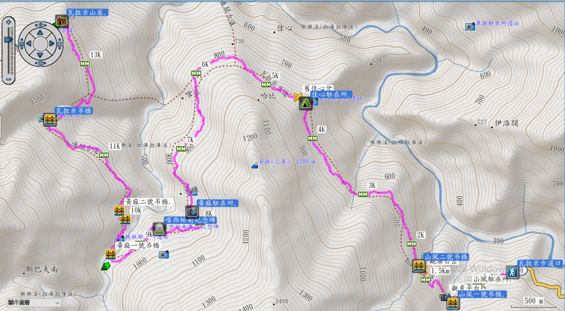 11:35瓦拉米吊橋,H1029 m,約在步道11.9K處,橋墩漆成藍色,長約30幾公尺,瓦拉米吊橋之後,可看到路標往瓦拉米山屋只剩1.6K,路基變得寬敞,古道尚遺留完整的駁坎,走起來很舒暢;這條路是當年理番政策下用來運大砲攻打原住民的,回想當年,彷彿走進了時光隧道。