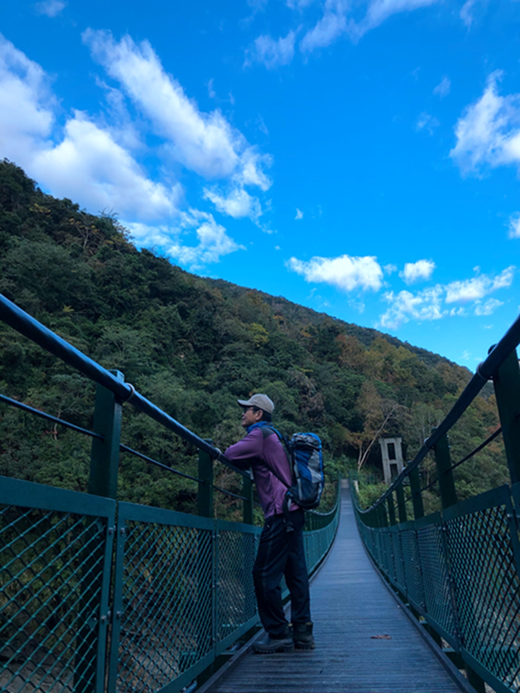 07:33山風ㄧ號橋,H528 m,約在步道1K處,橫越於樂樂溪山谷之上的「山風一號橋」,為近年重新整建,去年才對外開放,長約120公尺,是瓦拉米步道最熱門的拍照打卡景點,離地約30層樓高,走在吊橋上,猶如漫步在天空步道上;在橋的西側,是一處延伸出山谷,由舊的山風⼀號橋的橋墩改建的觀景平台,可從另一個角度欣賞天空吊橋與山林美景;穿過山風⼀號橋後,原本寬廣的步道開始變得狹窄,有時甚至幾乎貼著山壁行走。