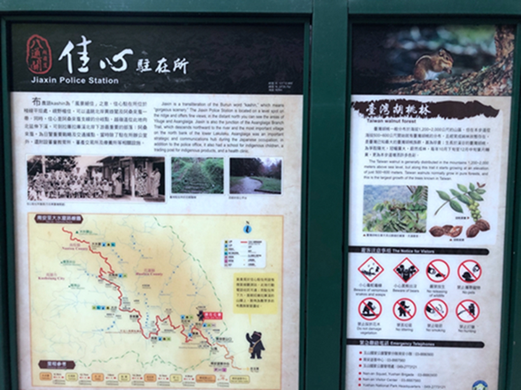 再往前150公尺是舊佳心岔路,心立有解說地圖,右側有路通往拉庫拉庫溪谷山腰的佳心舊部落。