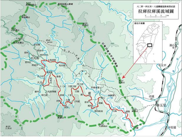 圖為清朝八通關古道東段路線圖與馬西桑祖居地之行路線 說明:1.虛線為位於拉庫拉庫溪北岸,西起大水窟經公山、卓溪山至玉里的清朝八通關古道 2.紅線為馬西桑祖居地之行路線 資料來源:林一宏,2004,八二粁一四五米:八通關越道路東段史話
