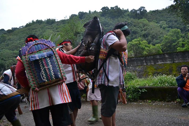 祭典一開始,林淵源帶領年輕人從山上往部落前進,高塋山、林秀山、林孝德,還有林淵源的兒子,也在行進的隊伍中,他們額頭上帶著tinaqis(頭帶)、手持busul(獵槍),用davaz(網袋)和patakan(背架)將獵物裝在背上。接著在村口鳴槍,唱起<背負重物傳訊歌>,由前頭領路的林淵源高亢地呼喊一句,接著全體一起行動的族人,以布農族慣用的泛音式複音合唱來答腔。