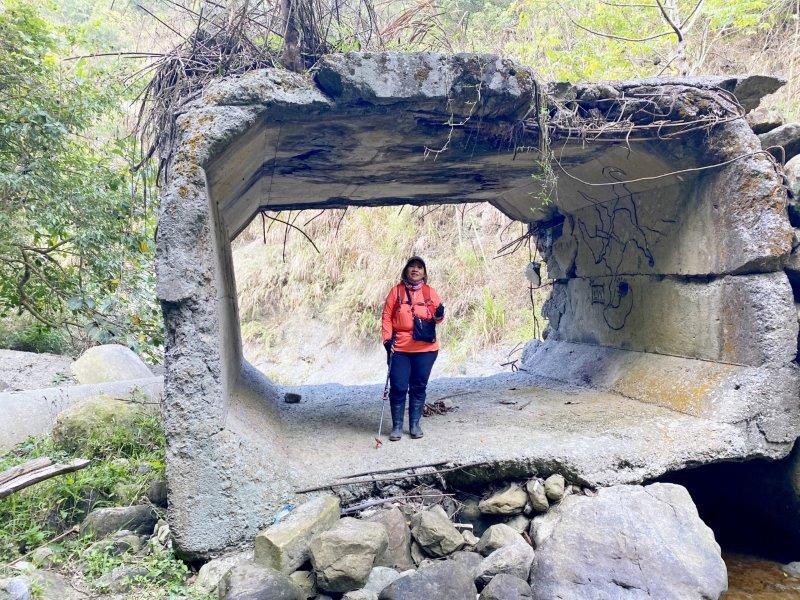 9:30抵仙女洞,右轉進入即抵「金山岩」,為一水神位小廟,合掌拜拜後,再退出至產道,陡上經檳榔園,取左,走上一段頗優的松林路,9:50抵山羊工寮,一旁菜園裡,唯一的住戶女主人正摘著油菜,往前打招呼並閒聊一下,感謝還送我們一大把現摘的油菜;之後續行產道,10:10抵大岩壁,此斜壁看起來還蠻壯觀的,走起來不滑,因此爬上拍拍照,再續行,10:30經右方一木造房子,11:00終抵北稜登山口,電線桿為「石岩枝29」編號。