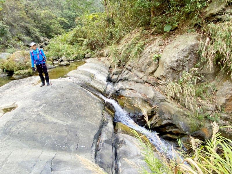 7:30開走,往前不遠,取左木階梯往下,續拉繩往下,7:50接產道取左,隨即抵仙女溪,取右抵涵洞,拍照後,續往仙女瀑布,8:05抵仙女瀑布,記得第一次到仙女瀑布(2013/10/12),是從瀑布對向往今日瀑布頂看的,四處看看、拍照後,原路回至下溪處,過溪取溪右側行,之後再拉繩下溪,於溪中過大石,再沿溪的左側行,沿途可看到清澈碧綠的仙女溪潭;9:10走上廢棄產道,還可看到電線桿「石岩枝99」編號。