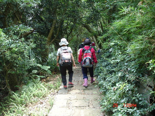 11:25遇石階路,往下走,沿途有指標,樹林蟬聲鳥聲聲聲不絕耳,熱鬧非凡,本想刀取筆筒樹心加菜,奈何樹高,因此作罷。