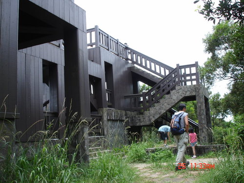 11:40抵觀景樓,也是中正山基點處。▲中正山(H646m)亦稱大竿林山、或稱彌陀山,北市三角點10號,土地調查局圖根點,地質為兩輝石安山岩,為大屯南峰支稜的山頭,非為獨立山峰,展望尚佳,其中正山的基石(已缺角),在觀景樓南牆角下方,其觀景樓台為三層式,旁有生態解說牌,直行向西下中正山停車場(十八份登山口)。哇!沒水。
