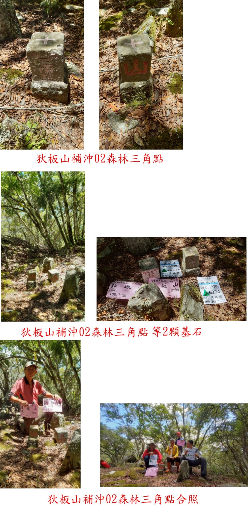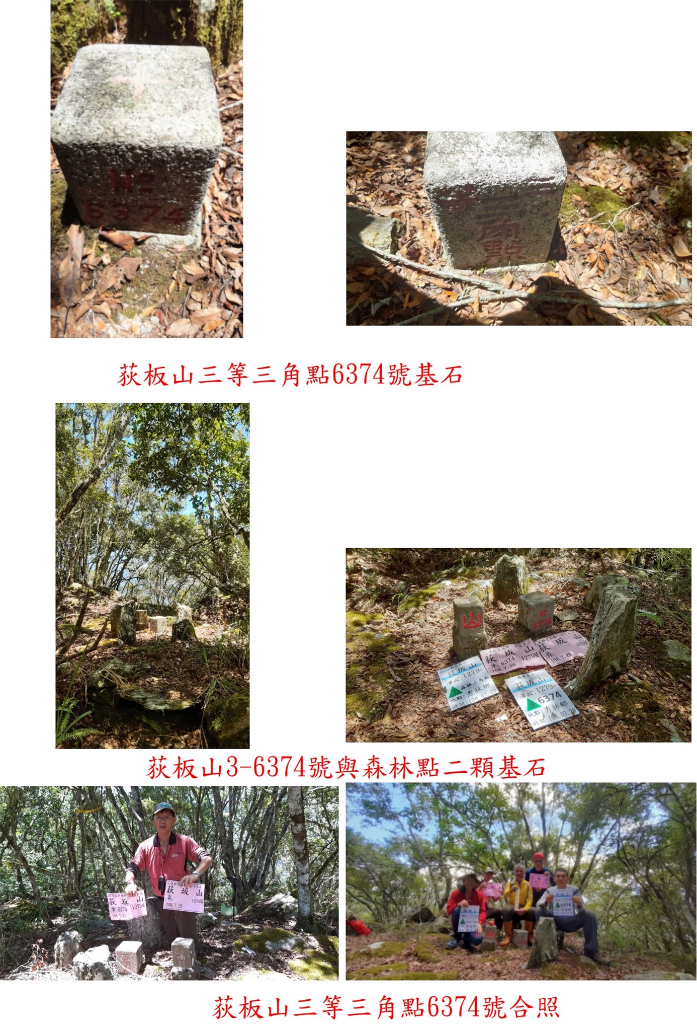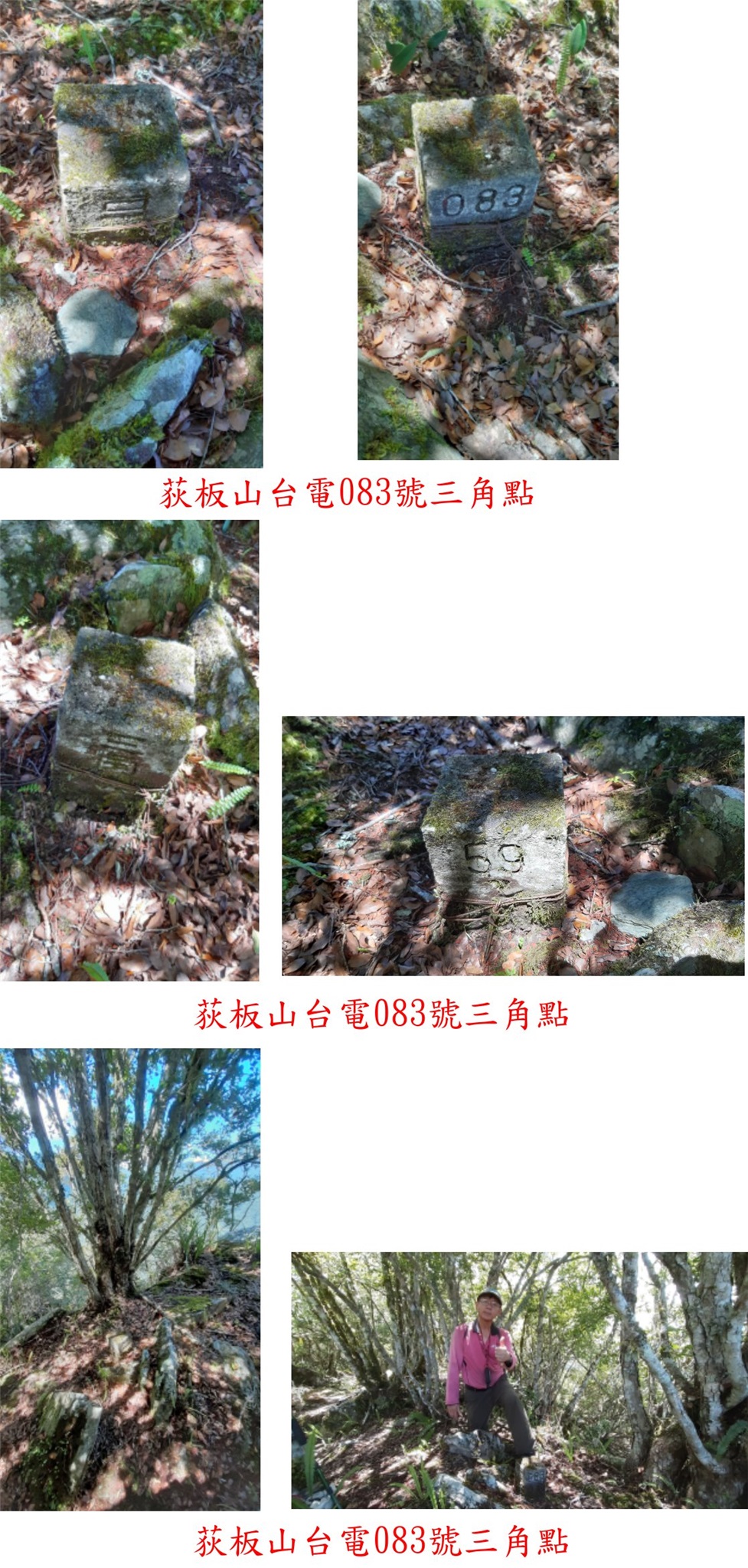 2、荻坂山:又稱西奇良山,位於花蓮縣秀林鄉,標高1279尺,三等三角點6374號基石與補冲(02)森林三角點,旁另有台電083號三角點;座標296358 2676318。