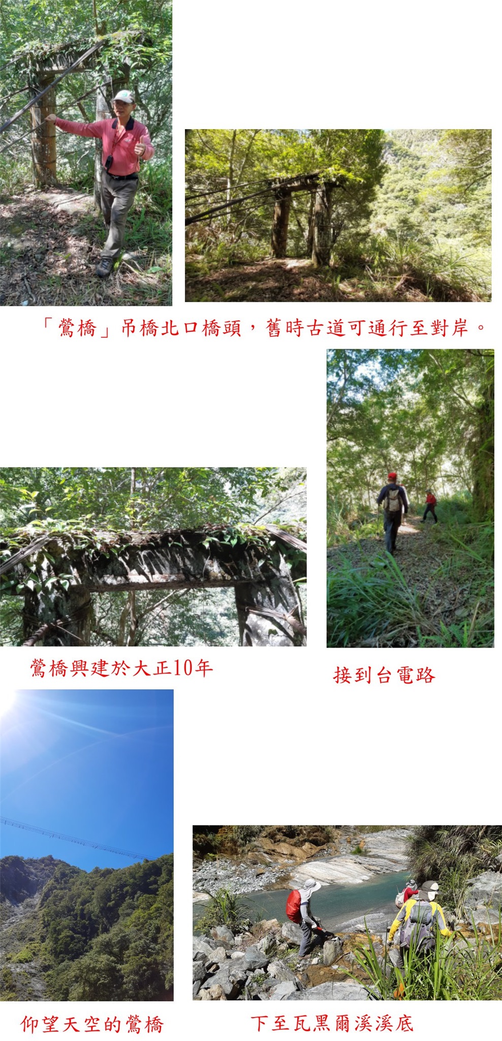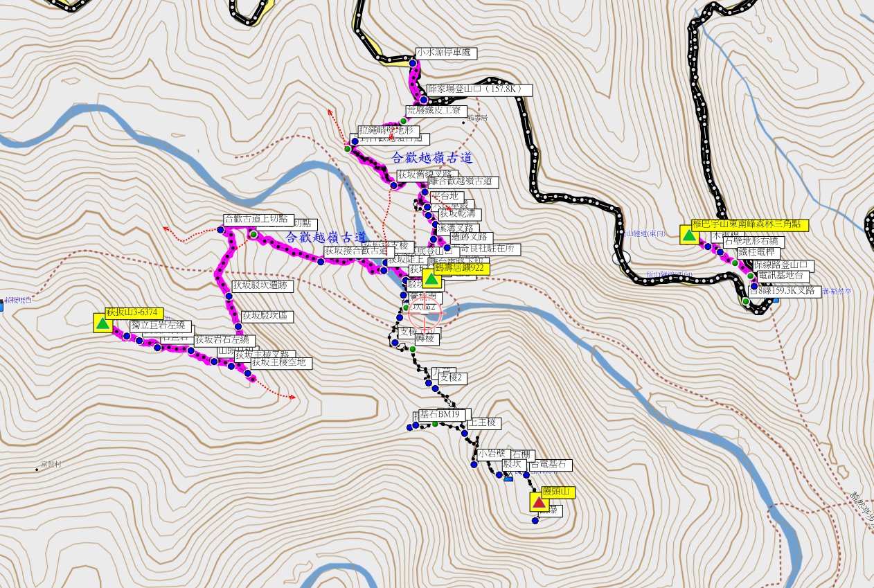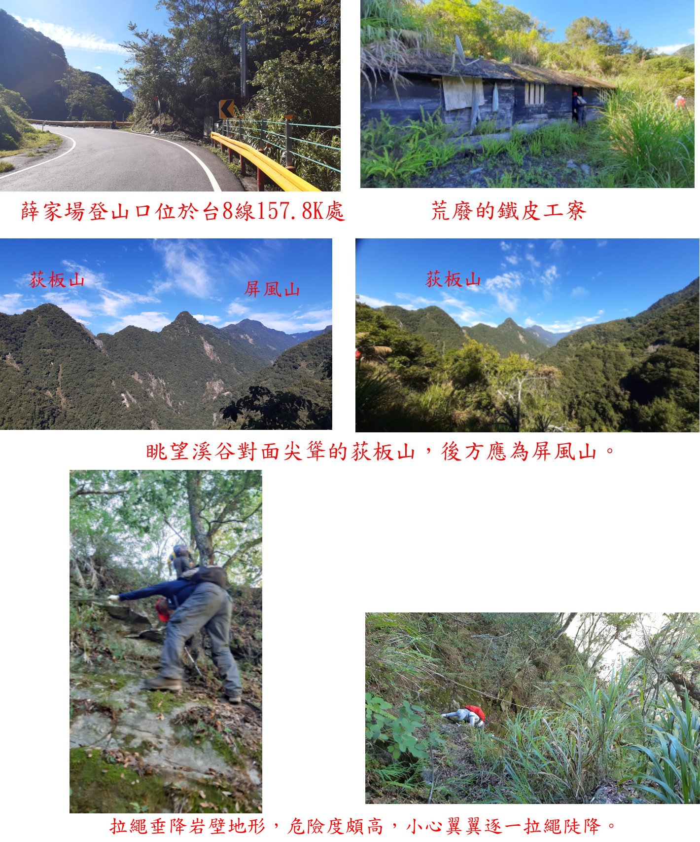 7/26-7/29四天約山友來中橫東段登山,第四天(7/29)的行程為荻坂山,早上天祥找不到早餐店拖到很晚才出發;薛家場登山口於中橫157.8K,山徑順小支稜陡下,最後還有段危險度頗高岩壁地形,拉繩垂降至合歡越嶺古道(洛韶警備道),古道沿著舊白陽大斷崖開鑿曝露感頗高,走段古道再下切至西奇良遺址,有駐在所等遺跡,於鶯橋前的駁坎邊見到鶴壽居鑛務點第922號基石,此段路走了1.5小時,鶯橋吊橋建於大正10年已損壞,舊時古道可過橋至對岸;拍照後再度下降至瓦黑爾溪溪底,過溪走一小段至對岸的登山口,循山徑陡上接回合歡越嶺古道,古道保存完整走一段再度上切,山徑路況頗佳,沿途涼風徐來頗為舒適,由溪底上來爬升8百餘公尺,走了2小時又23分鐘登上荻坂山3-6374,基石旁還有顆森林三角點,要離開時孔孟子於崖邊看到另一顆台電083號三角點,此山去程走4小時又33分鐘;原路下至溪底再爬回古道陡上回至登山口,回程走約3.5小時,此山往返費時8小時又52分鐘,此山計有4顆基石入帳,沿途還有古道與駐在所等遺跡,值得推薦的一座山。