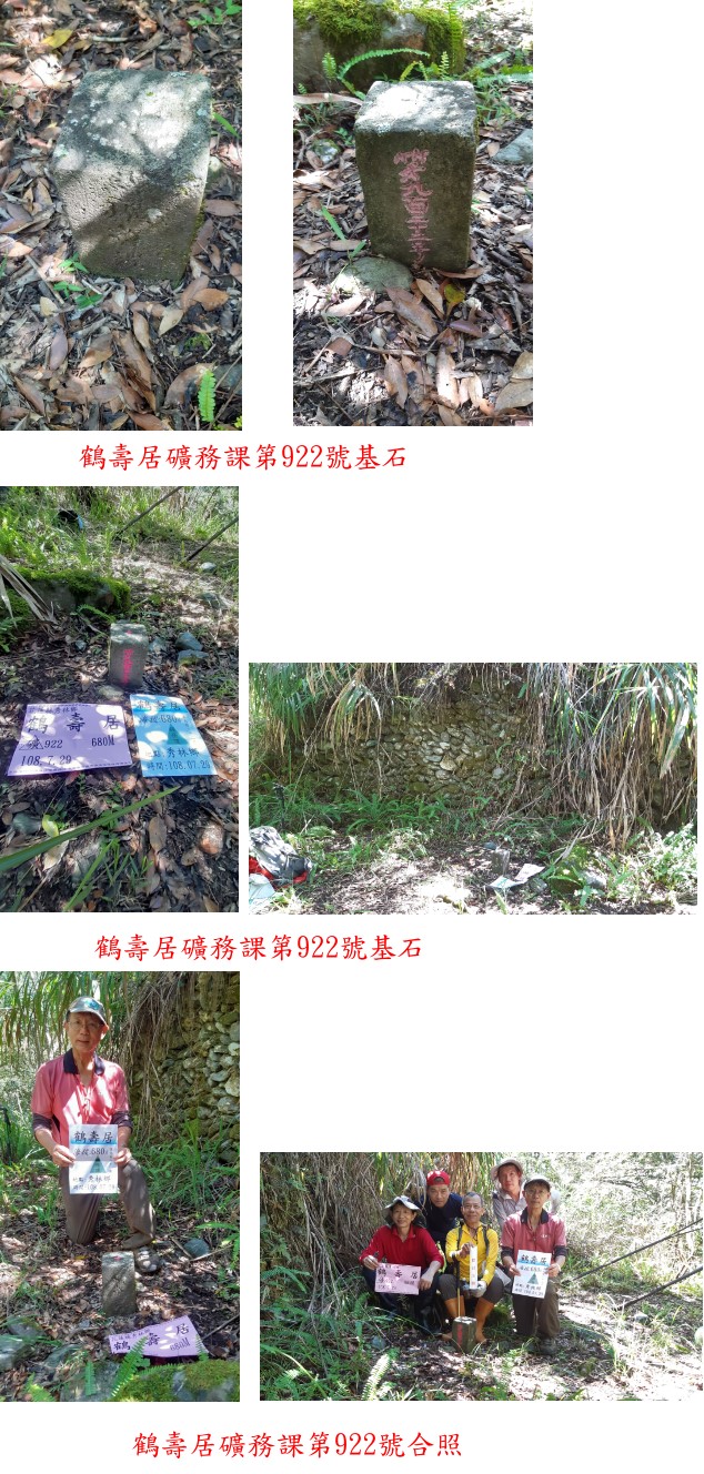 1、鶴壽居:位於花蓮縣秀林鄉,標高712公尺,鑛務課第922號基石;座標297415 2676449。
