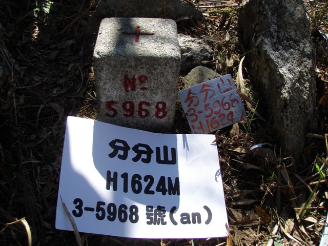 9:45到達一鐵皮工寮,因有伐木工程,所以車子一路開到登山口,讓我們撿到便宜少踢一些林道,10:00開走,由工寮旁小徑進入,過崩崖,續走廢棄產業道路,經過廢棄工寮,繼續沿廢棄林道,不久右上開始陡上坡,沿途空曠處可展望東郡大山、治茆雙峰,經1530鞍部,之後順稜經1580山頭後稍下坡再陡上坡,於11:30登頂分分山,標高1624公尺,有一顆5968號三等三角點。
