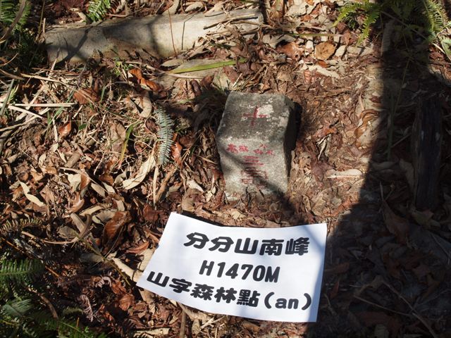 山頂展望不佳,先吃午餐,吃飽後再拍照,基石旁有幾棵「馬告」(原住民的胡椒),味道濃郁。12:10再啟程往分分山南峰,順著南側稜脊一路下降,12:30登臨分分山南峰,標高1470公尺,有一顆山字森林點;拍完照,於一旁杉木林中休息聊天,13:00再出發陡上回程,回至分分山後,再一路漫步下山,於14:40回抵工寮處,工寮大姐還熱情泡茶請我們,真是感恩!此時小花發現他的GPS不見了,趕緊回頭去找,好在皇天不負苦心人,終於找回失物。