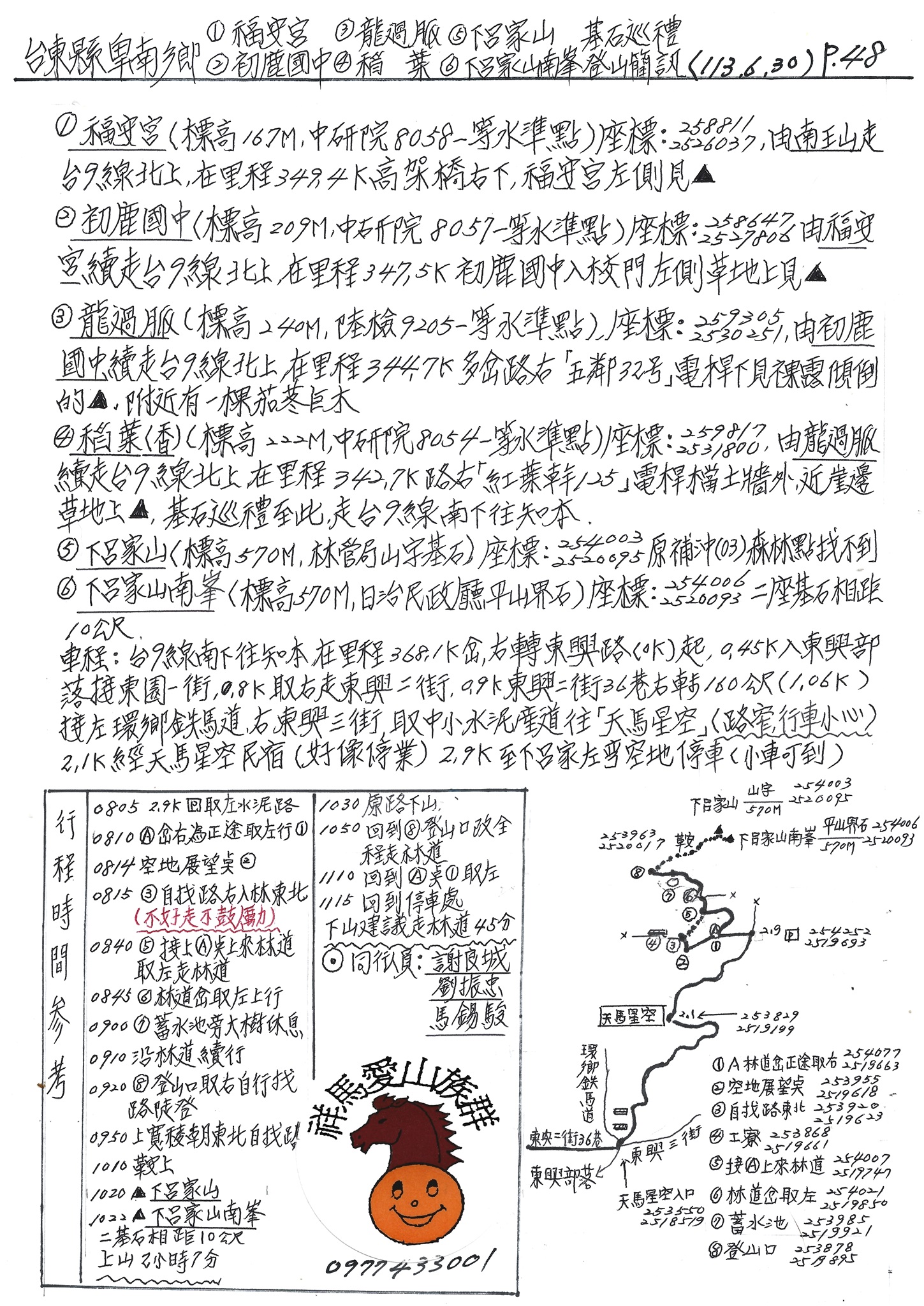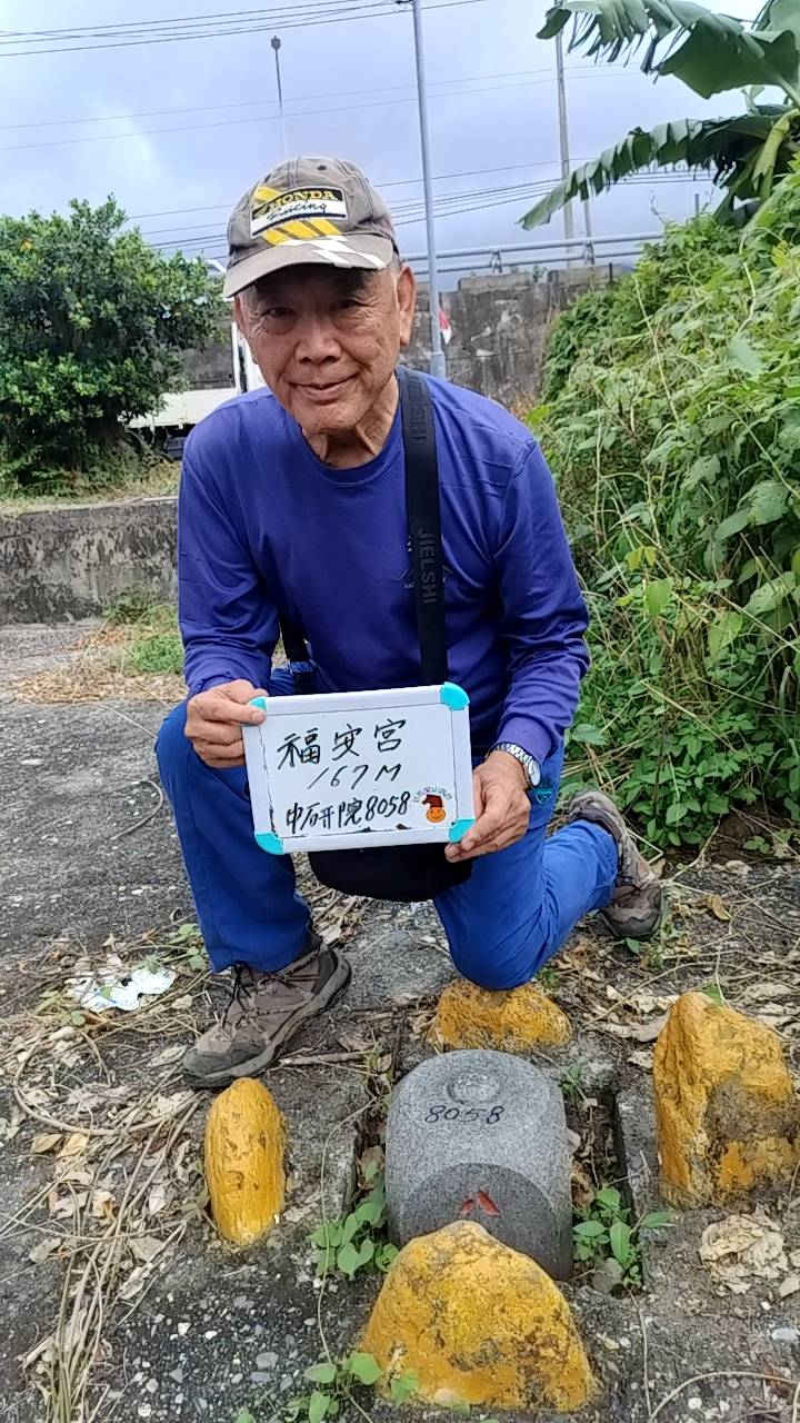1福安宮(標高167M,中研院8058一等水準點),座標:258811.2526097,由台9線北上,在里程349.4K高架橋下右側廟旁附近