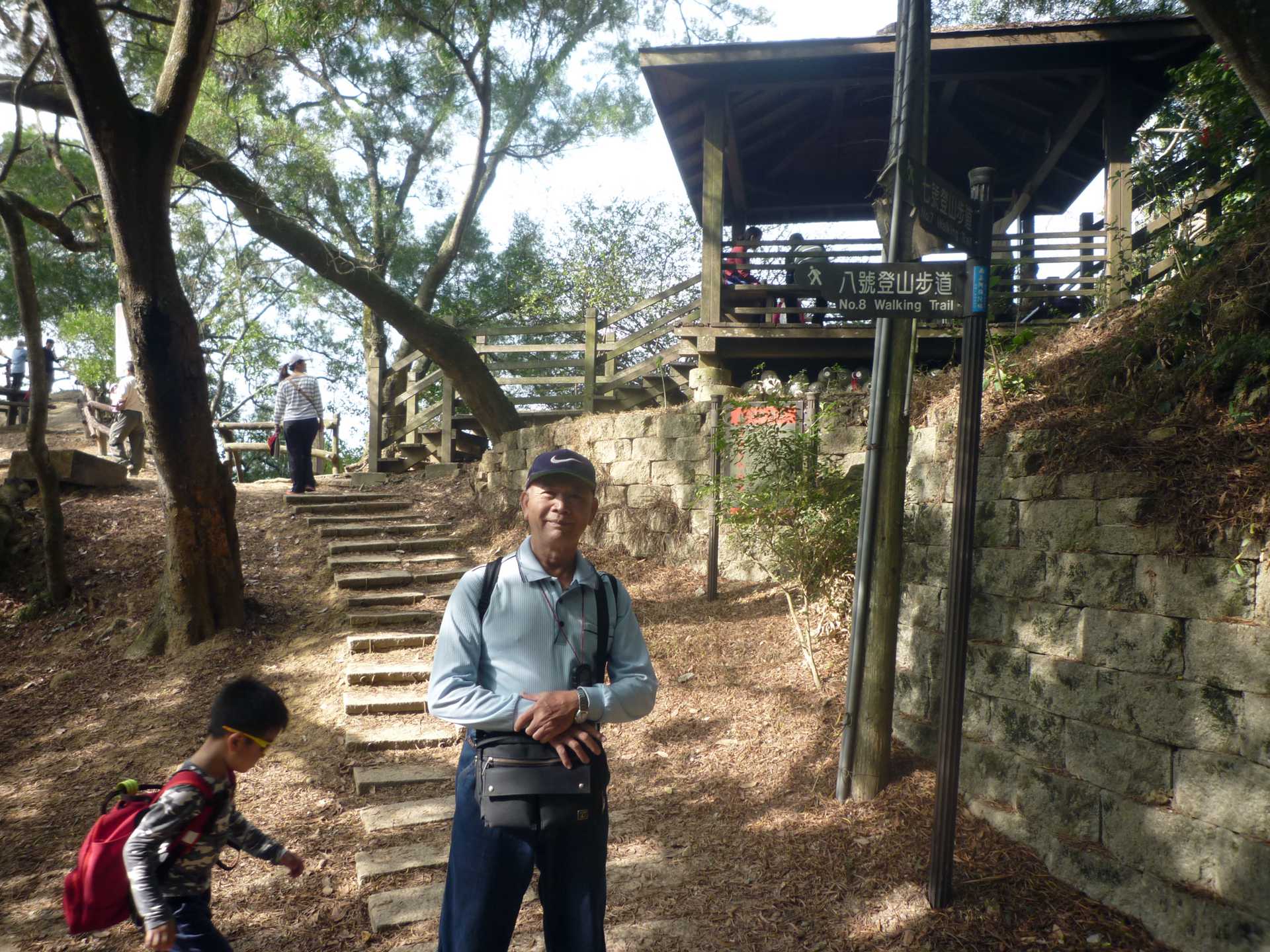 11大坑風景區8號步道由上而下,前段為木棧梯,中段為相思圓木步道,後段為水泥路