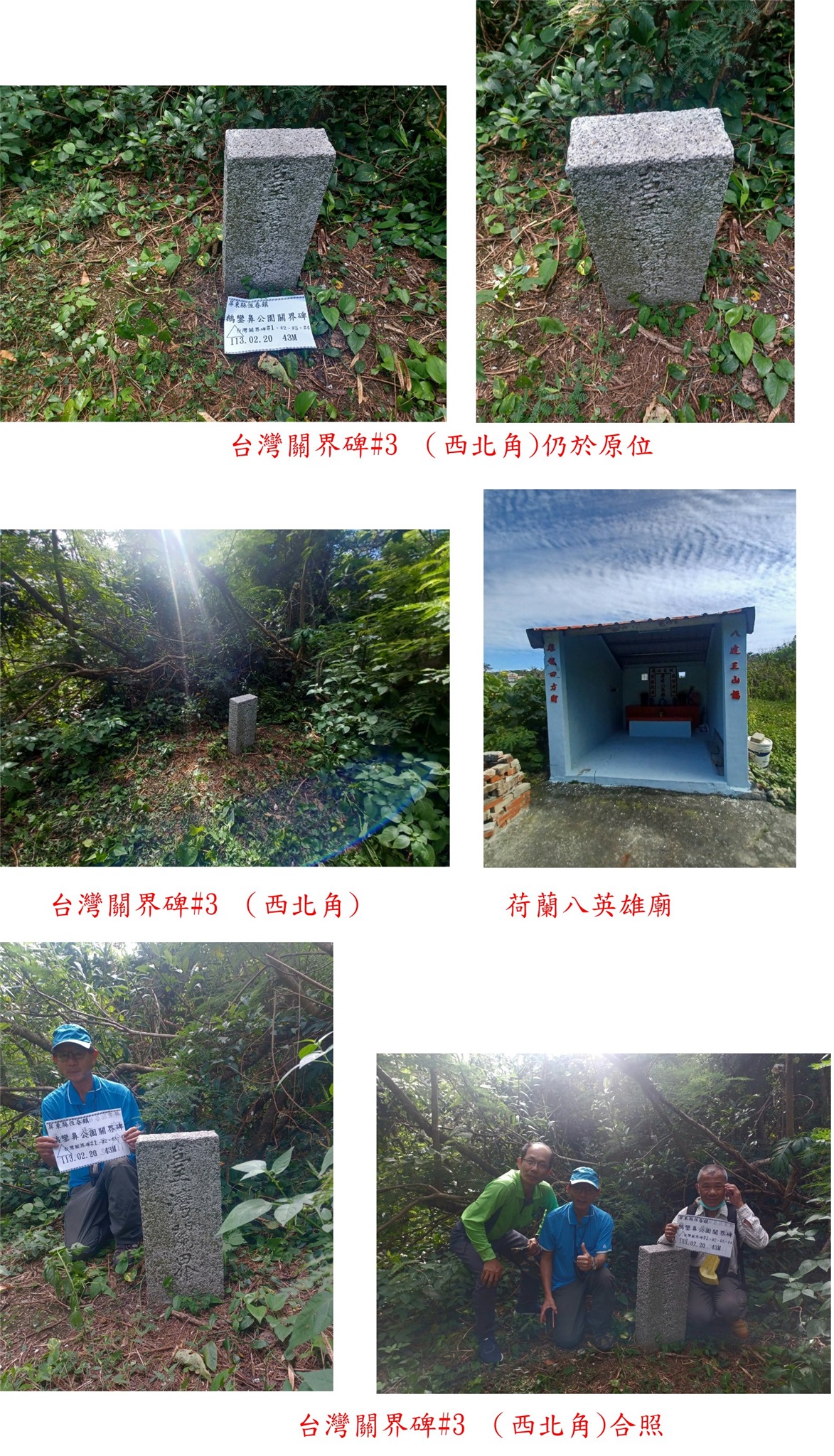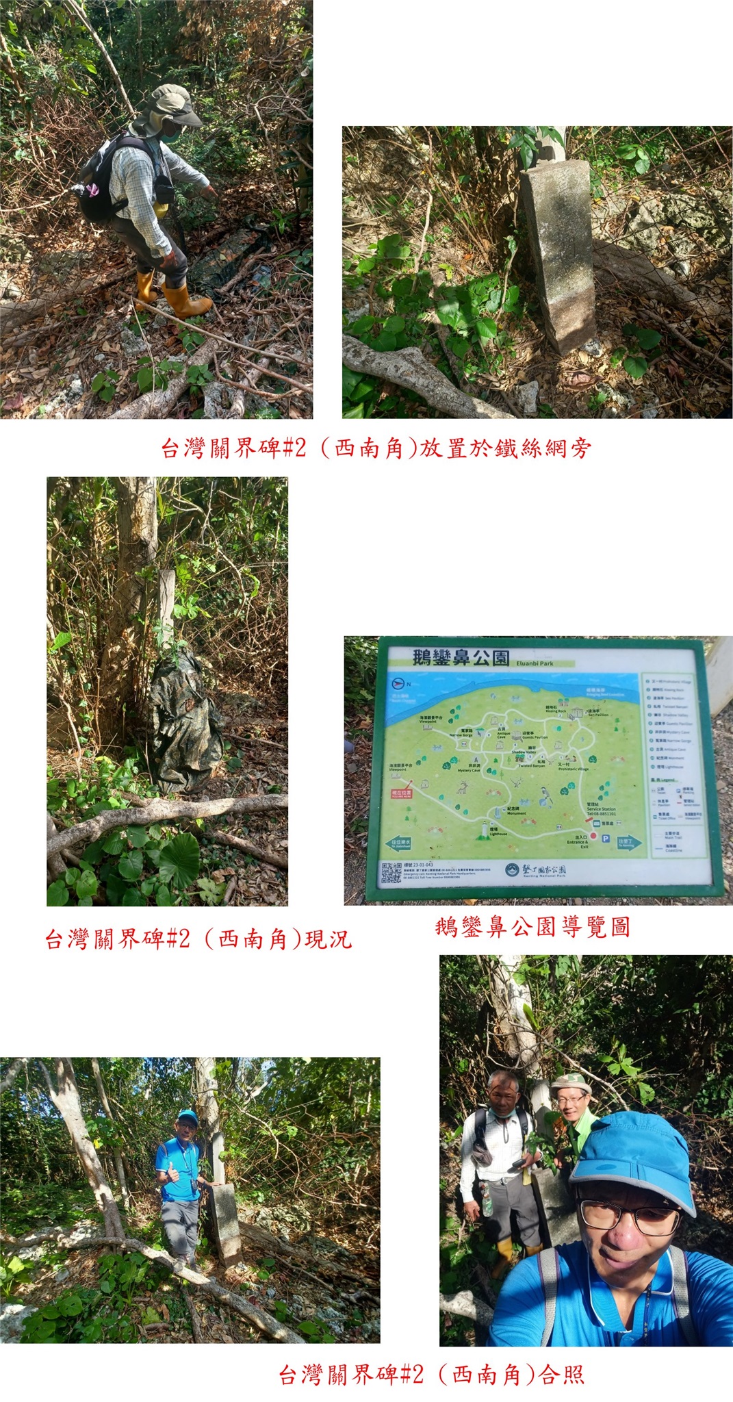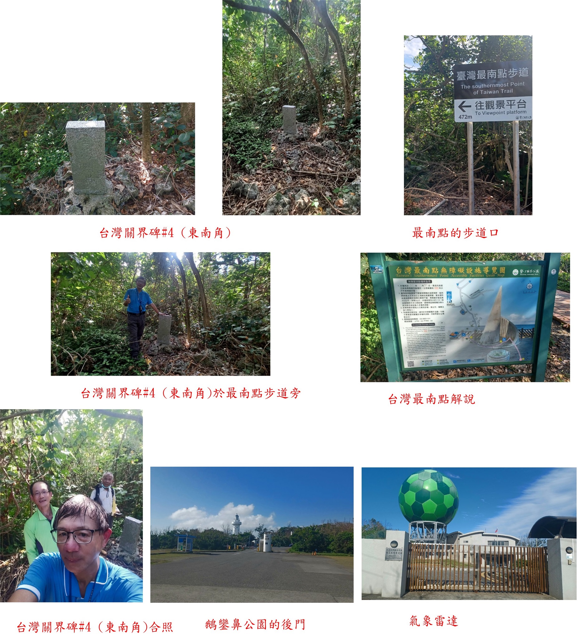 鵝鑾鼻公園正門正在整修,由攤賣區的臨時售票亭進入公園,走園區步道往北再右切至鵝鑾鼻管理站辦公室,順著工地圍籬邊往北,還是被公園的職員看到,說明後陪我們去找關界石(長官交代怕外人破壞);經過荷蘭八英雄廟,進入樹林隨即見到台灣關界碑#3,4塊臺灣關界碑為清光緒九年(1883)鵝鑾鼻燈塔竣工時所立;此碑高