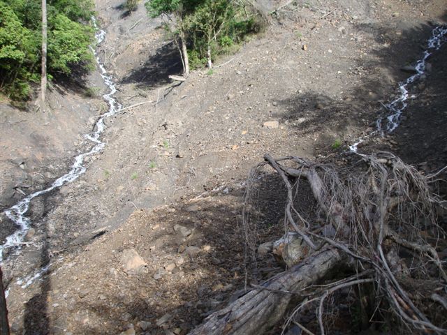 連著幾天的雨, 溪水很急, 有根大倒木橫亙其中, 橫跨濕滑的大木頭, 溪水聲很大, 隊友的聲音也大, 轟隆隆的, 聽不清楚只覺得心煩意亂, 只好請他安靜(對不起), 自己慢慢的爬著過去~ 有點狼狽~