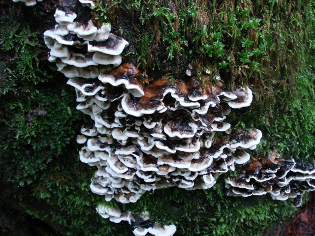 微雨中, 轉彎處的樹上, 白色晶瑩的蘑菇落落不規則的長了兩三排…真美, 春雨過後, 溫度節節上升, 是適合蘑菇生長的季節, 這一路上, 大大小小, 白的黃的褐色的…不知名的菇遍地都是…可惜不知道何種可食, 要不然煮個湯可鮮甜了~