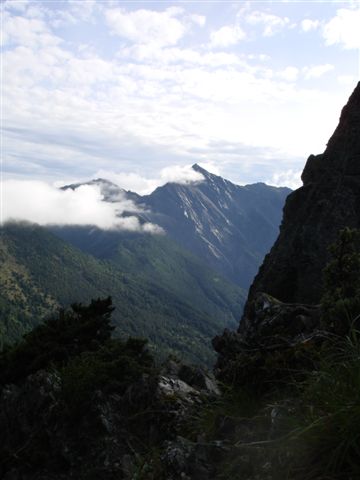 6:40 ~從營地出發~ 昨天有上不完的坡, 今天就有下不完的坡, 非常公平, 傳聞中的鬼門關斷崖, 有架繩並不危險, 況且天氣有點好轉, 遠方的中央尖山時隱時現, 心情好到不行~