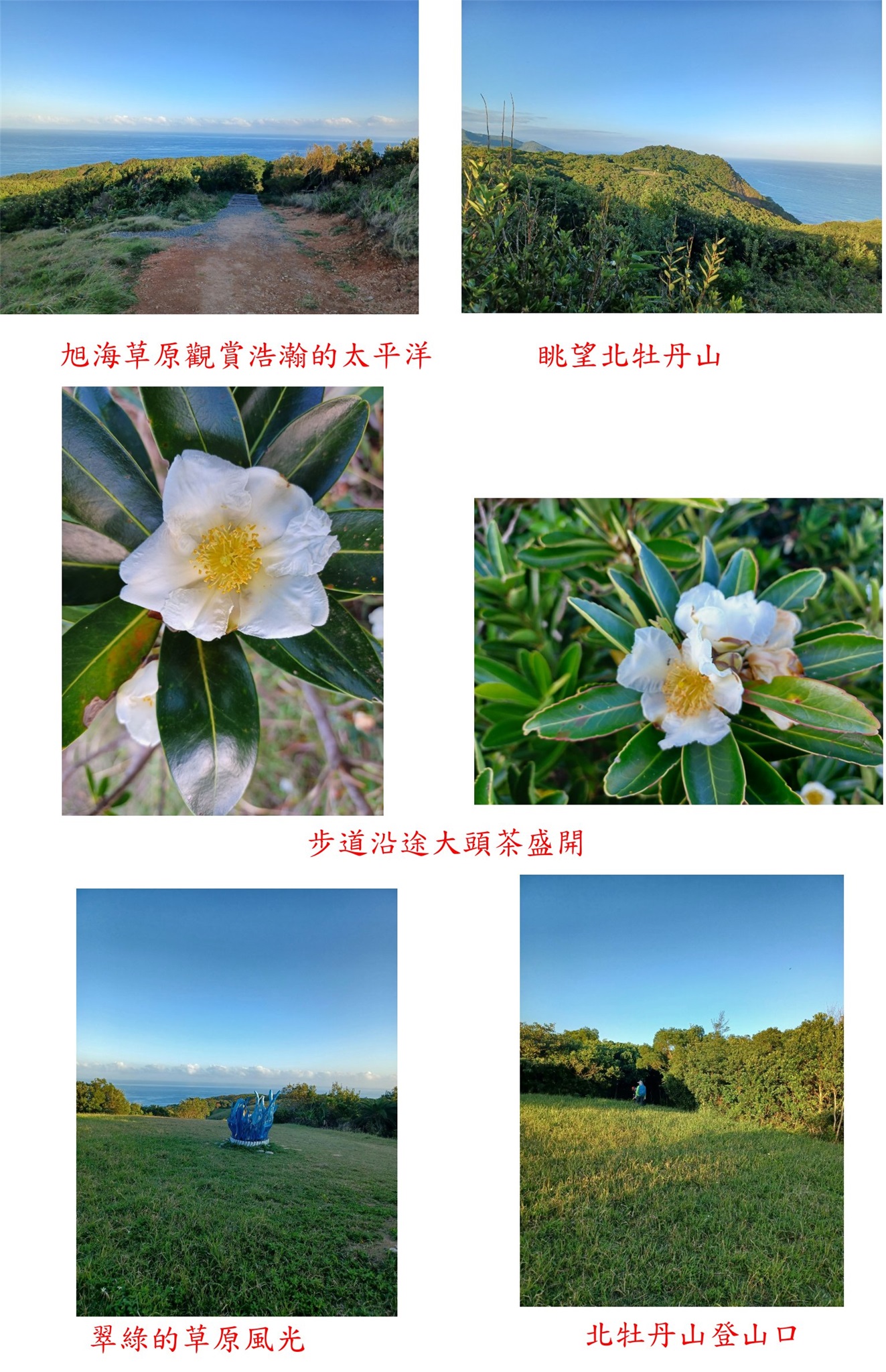 16:44草原涼亭,高214公尺,生態步道與草原步道叉路;取右生態步道往旭海漁港方向緩下走170餘公尺,沿途大頭茶花盛開。