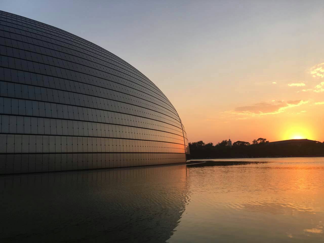 29國家大劇院,外圍人工湖環繞,波光倒影,為現代頂尖建築