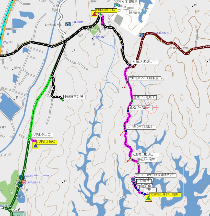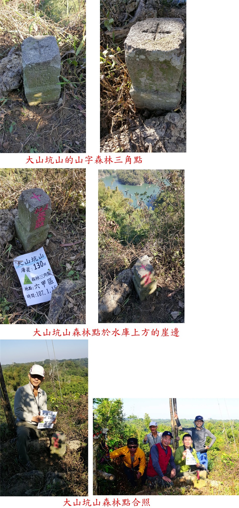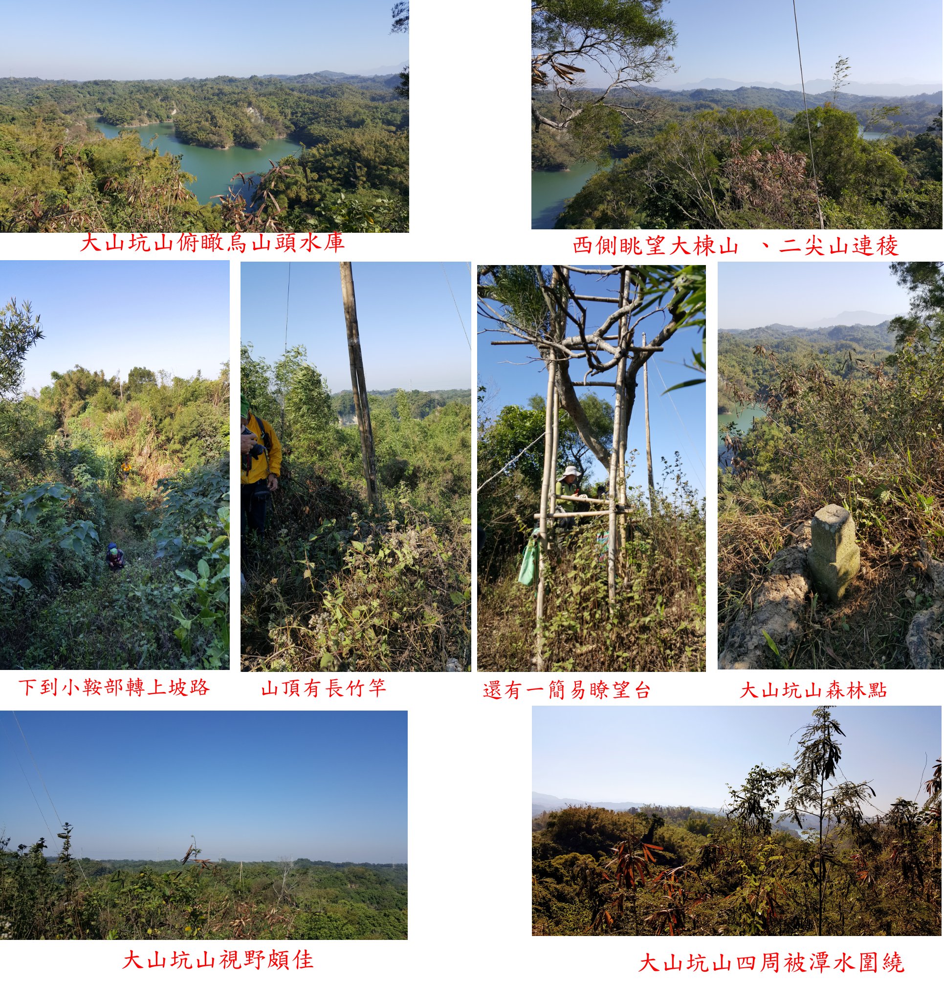 1/13到台南參加老蔡兄兒子婚宴,順道約山友於台南登山,第三天(1/15)走烏山頭水庫周遭的山,校長也來助陣;第1座為大山坑山森林點,此山深入水庫集水區難度很高,去過的山友屈指可數,前段為廢產道,接近水庫邊時地形複雜花了不少時間找路,高度只有130公尺的小山去程走了3小時又8分鐘,往返費時4小時又50分鐘,於水庫集水區上方景色很美;此行中途找到一顆大山坑山前峰嘉南水利會界石,現路已砍過且有路條,想去的山友快成行。