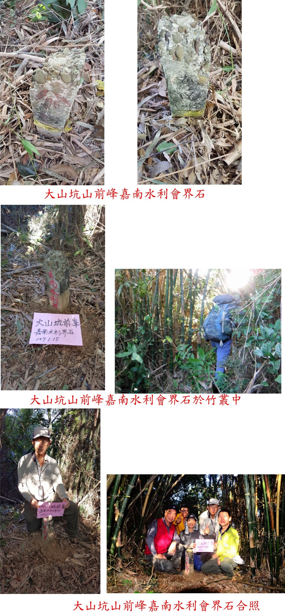 08:19△大山坑山西北峰,高102公尺,嘉南水利界水泥柱;於竹叢的小山頭找到一破損的水泥柱,清理後水竟然刻有「嘉南水利界」字樣,此即7777稱的115山頭,命名為大山坑山西北峰好辨識。
