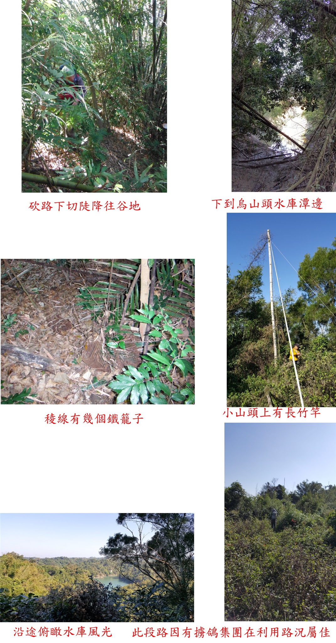 09:30上抵105山頭,稜線明顯左側可能擄鴿集團走的路線,回程時曾嘗試走看看亦要砍路;取右順稜行,前有幾個鐵籠子,沿途俯瞰水庫風光,稜線植被密時則腰繞而過。