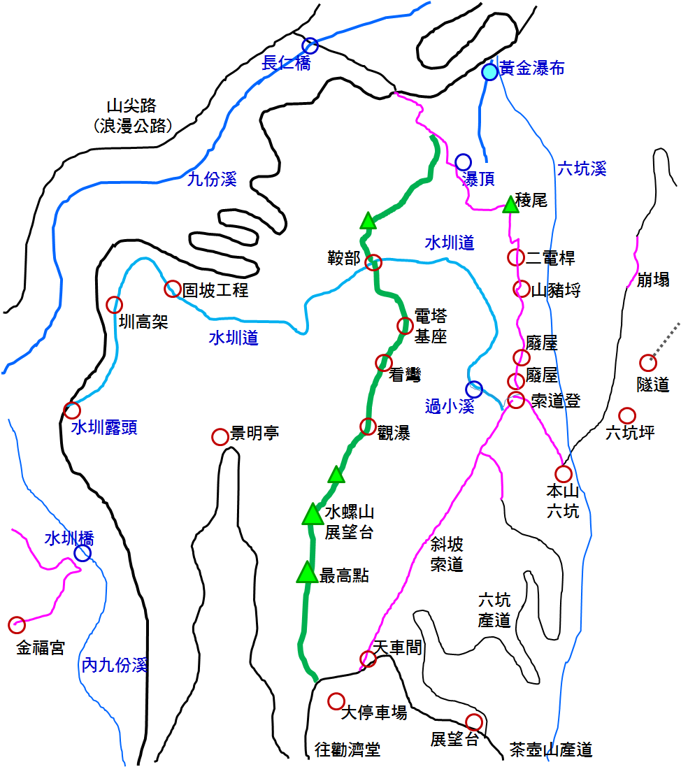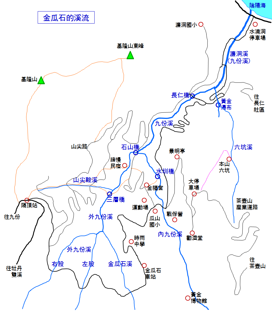 (2) 外九份溪的上游有三條支流,金瓜石溪、外九份溪右股和左股。