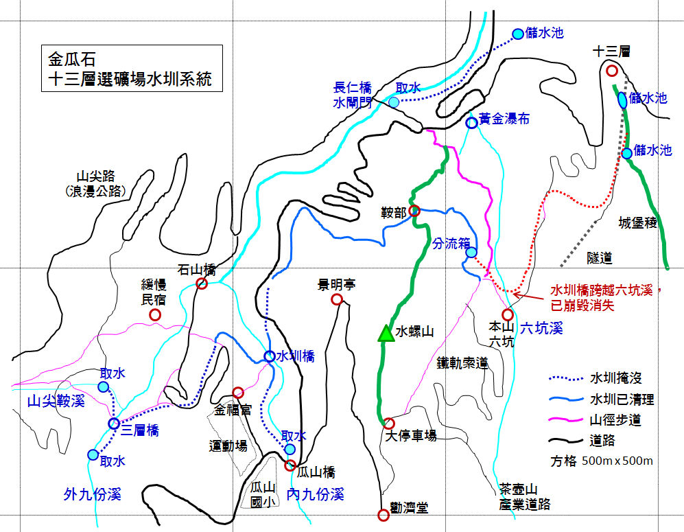 (2) 從山尖鞍溪取水,經三層橋和從外九份溪取水的水圳匯流,到了金福宮下方的水圳橋頭,和從內九份溪取水的水圳匯流,水圳鑽過金水公路,腰繞金水公路上方峭壁,再腰繞到水螺山稜鞍部,最後到本山六坑,再引水進入城堡稜上的巨型橢圓儲水池,供選礦場使用。