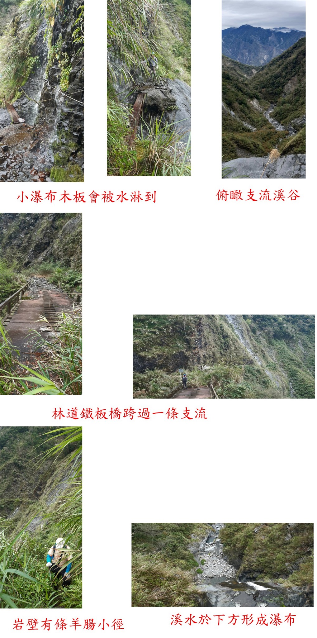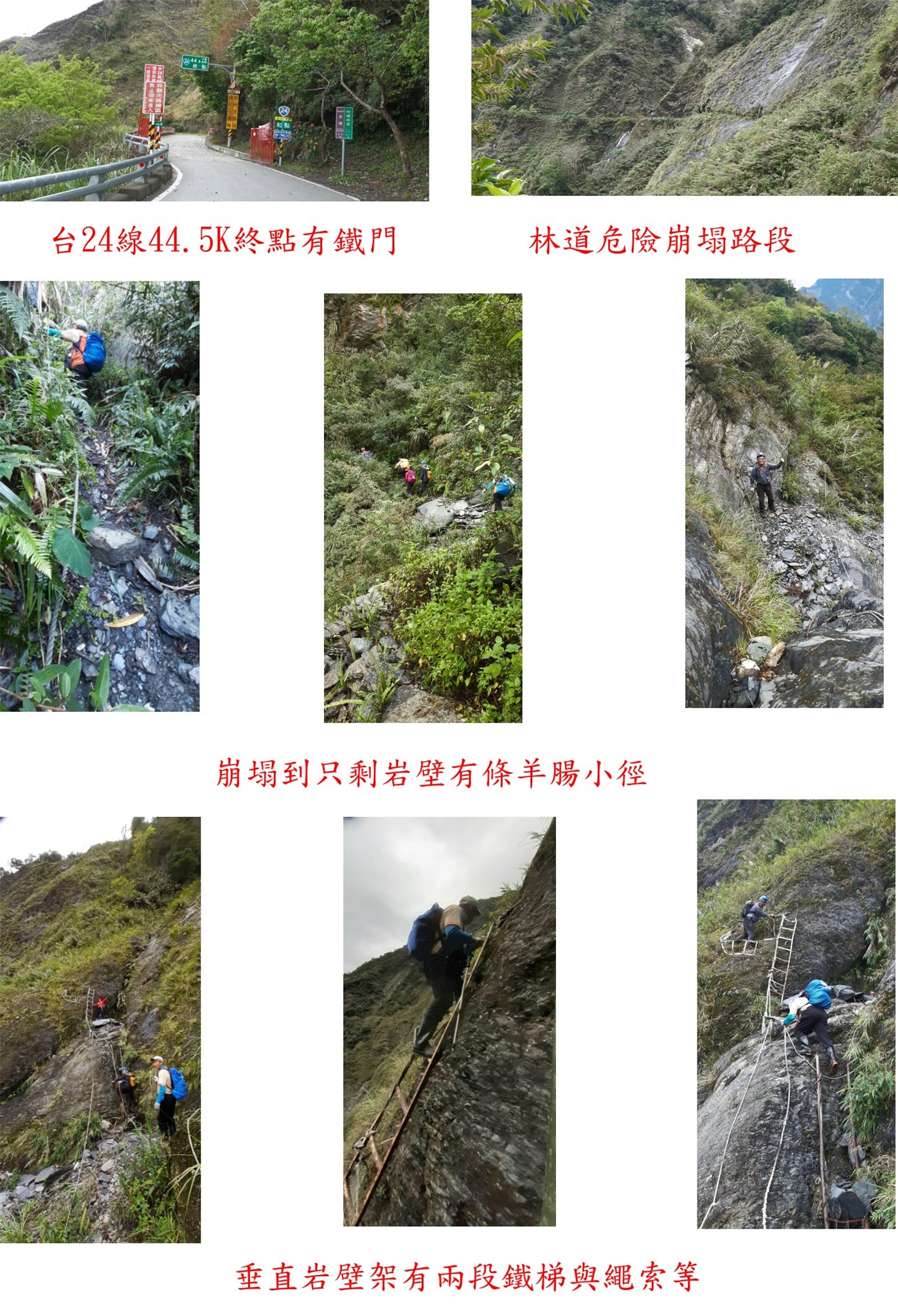 10:26林道崩塌處,約於林道2.45K處,再來的這段林道柔腸寸斷,崩塌到只剩岩壁有條羊腸小徑,下過雨濕滑小心通行,拉繩陡下再陡上。