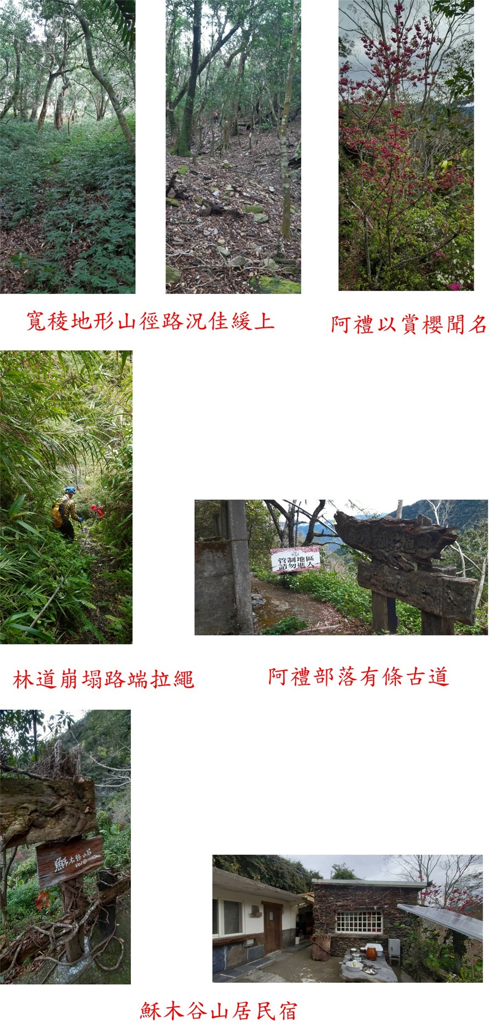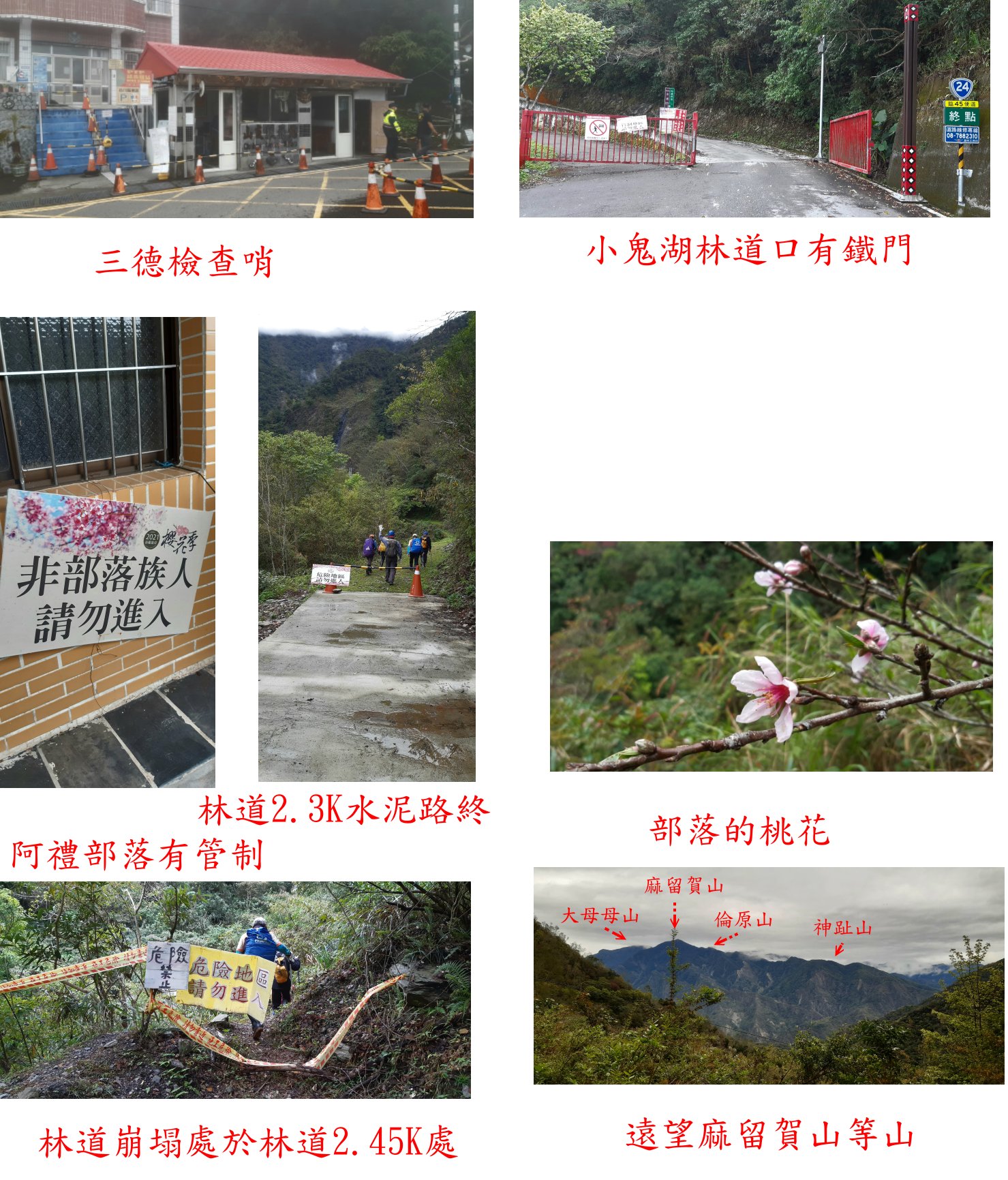 08:45三德檢查哨辦理入山登記,老蔡與台生於此會合,續行台24線往霧台至44.5K此線終點有一鐵門,因櫻花季鐵門開放;續行臨45線走約3K叉路,直行為小鬼湖林道口有鐵門擋道,往亞泥笛山的山友都停此踢林道上山,部落有條小路可接回林道;取右盤繞往上進入阿禮部落至6K叉路,有三角錐與引導人員,遊客車輛要右上停於舊阿禮國小;告知要往民宿方放行、部落道路續行0.35K叉路,取左狹窄巷道下坡走0.3K,前方即穌木谷山居。