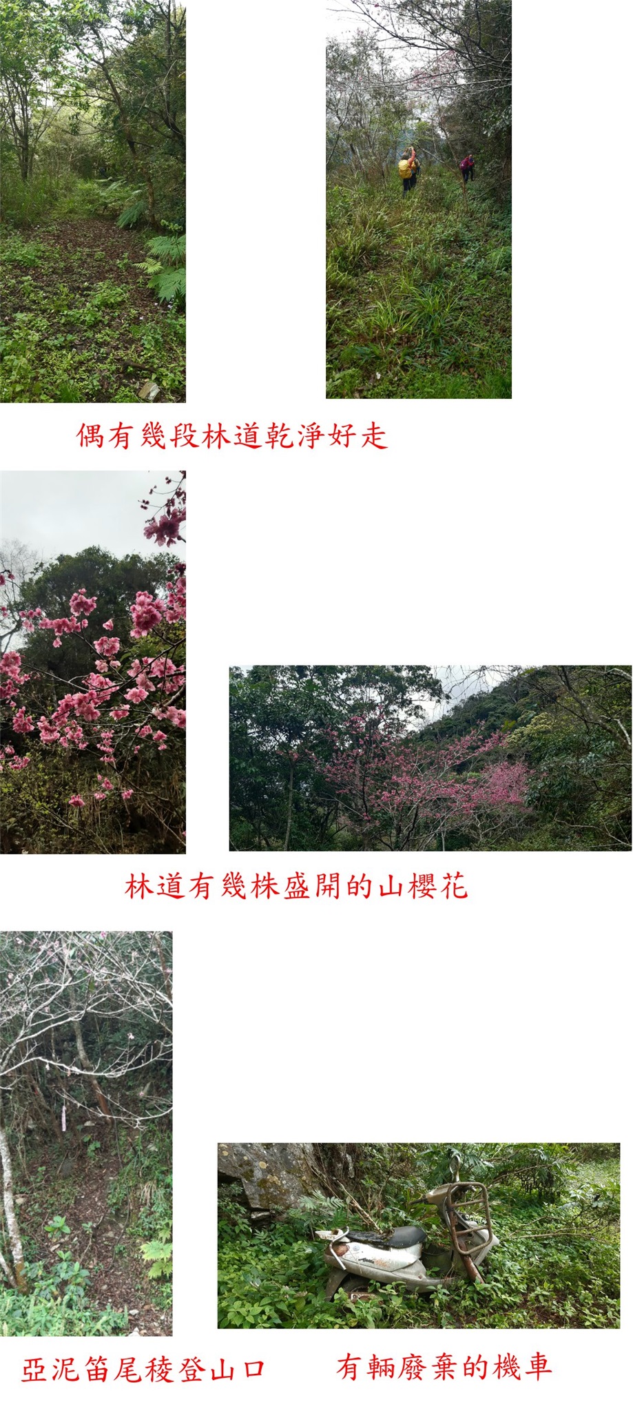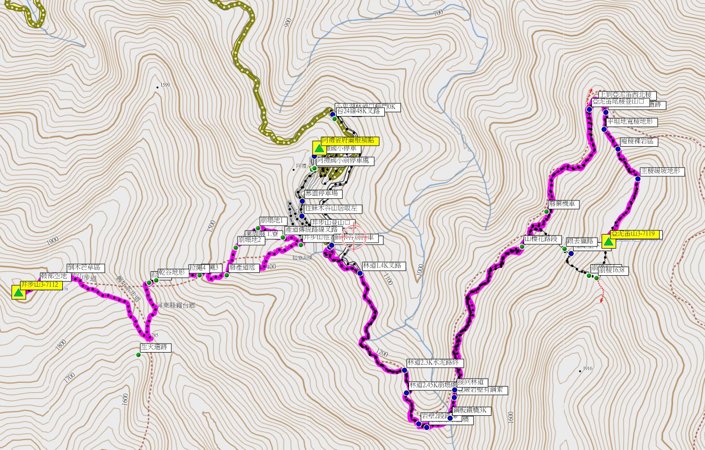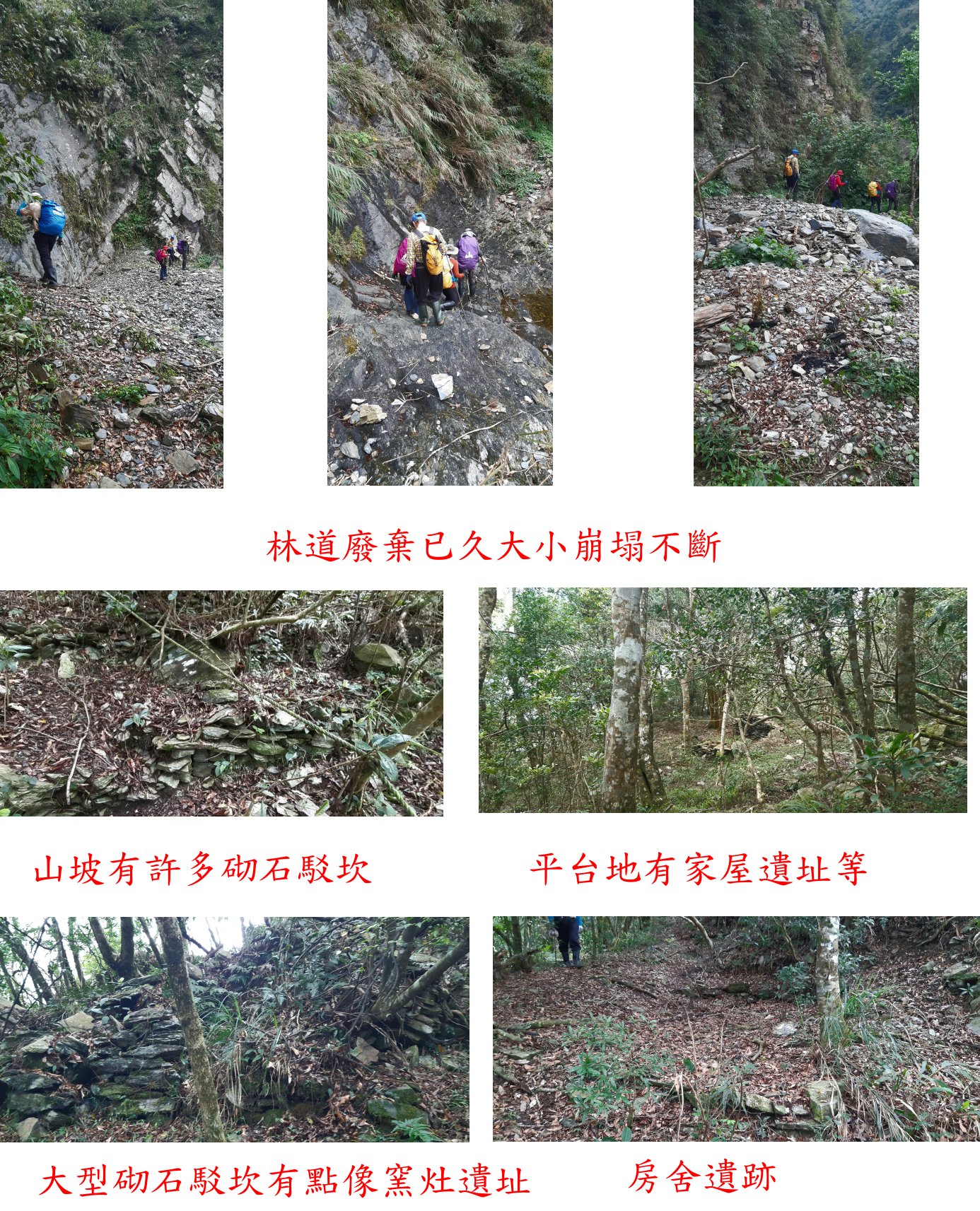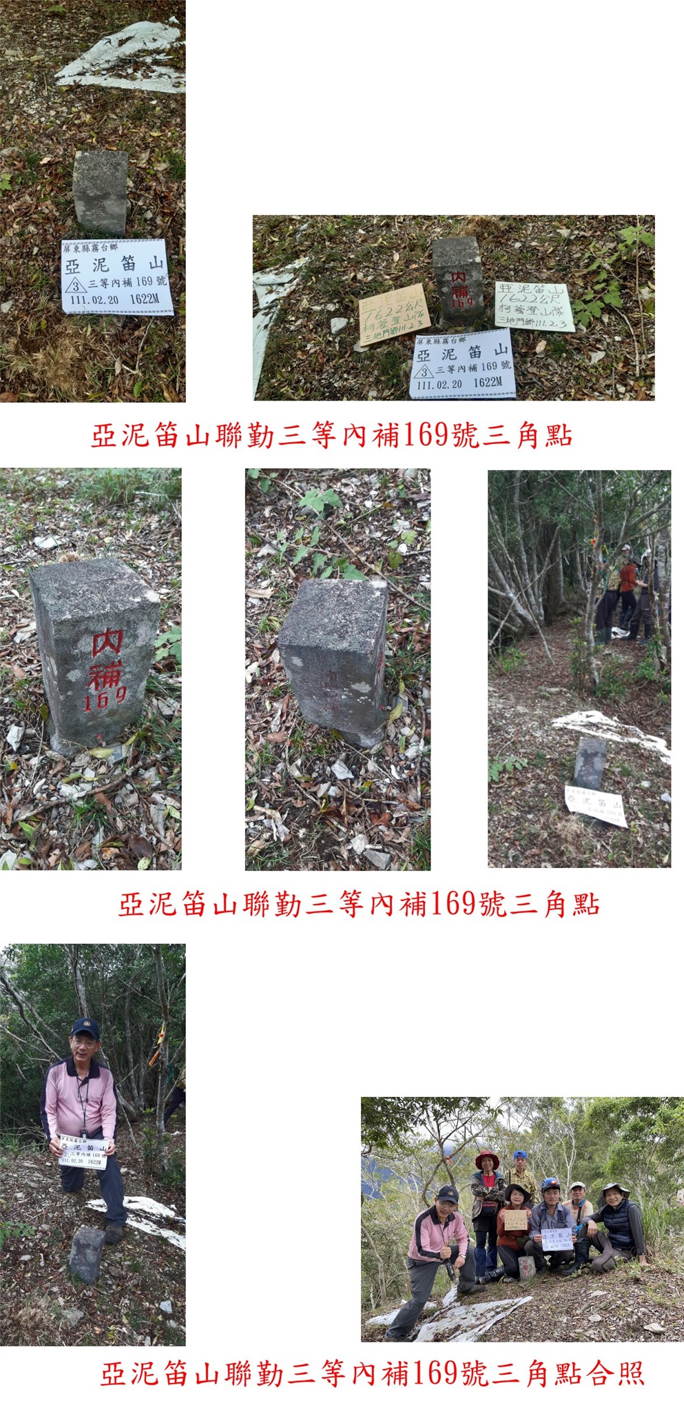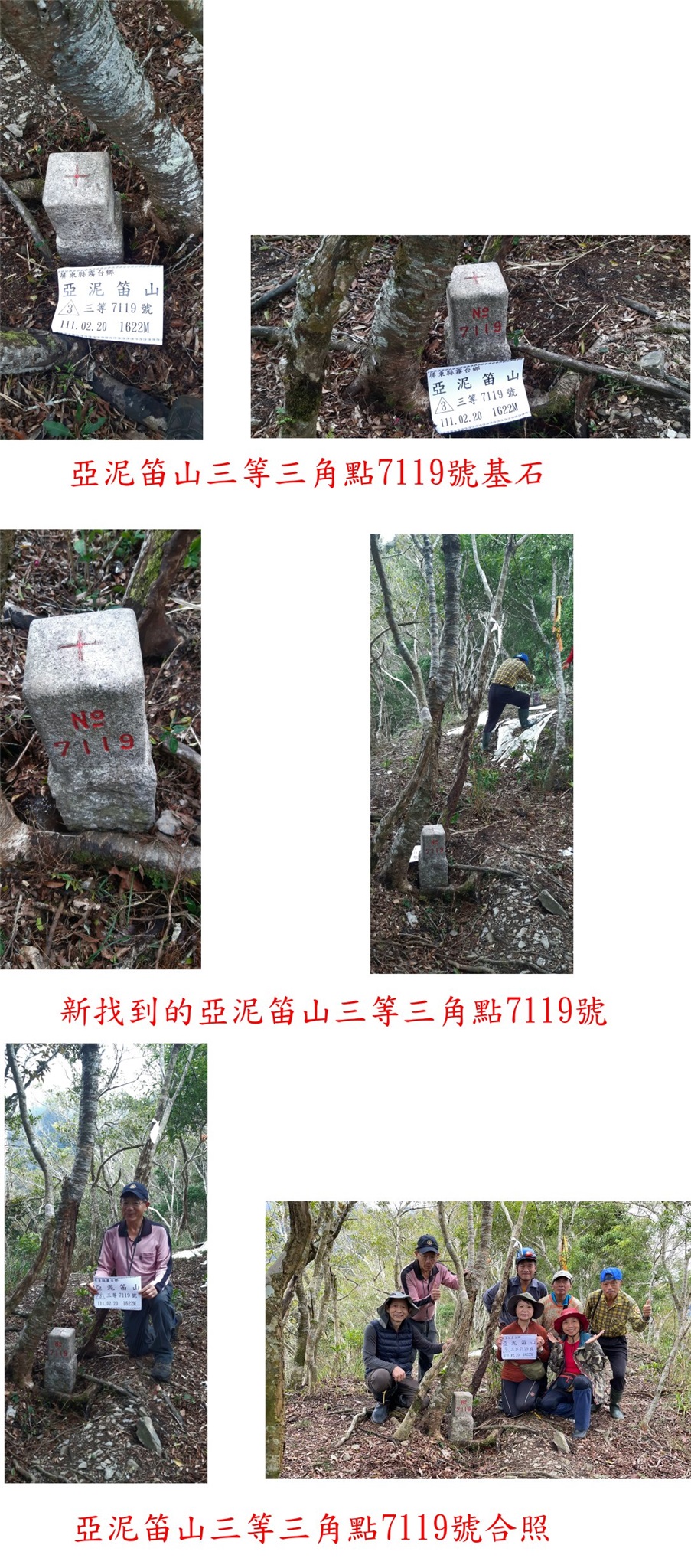 2/20早上先去撿3顆新找到的基石,再來為此行重點的亞泥笛山,柯藝新找出3-7119原點最近山友絡繹不絕,由三地門沿台24線往霧台至三德檢查辦入山登記,再來驅車至阿禮部落,部落前小鬼湖林道有鐵柵門車無法進入,想改走阿禮部落巷道下接林道,進入部落有管制浪費不少時間,最後停車於穌木谷山居民宿旁,部落小路下坡走約0.45K接到林道1.4K,續行到林道2.5K崩塌處,再來的林道柔腸寸斷,溪流的侵襲有一段崩到只剩岩壁,還好垂直岩壁有鐵梯與架繩,小瀑布下還有木橋,另有一處外突岩壁有鋼索可橫渡,通過後林道大小崩塌仍不斷高遶或低繞通過,應有獵人在利用有條明顯小徑,終於抵達亞泥笛西北稜5.6K的登山口,取右路況佳的山徑順稜上登,沿途有駁坎與家屋等舊部落遺跡,至山頂見到亞泥笛山3-IC169與3-7119等2顆基石,上山走3小時又3分鐘(含午餐),拍照後原路返回阿禮停車處,此山往返費時6小時。