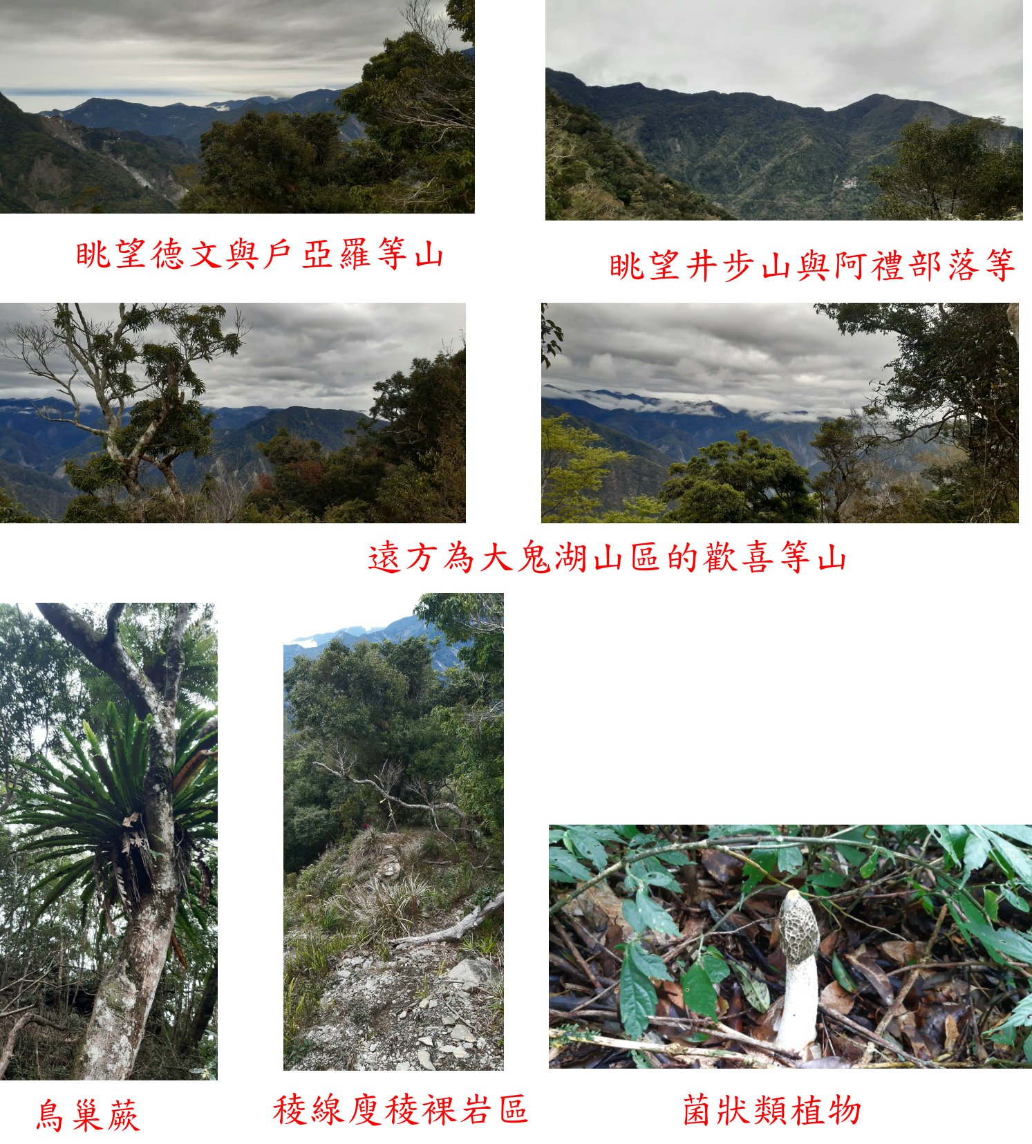 12:27廋稜裸岩區,視野開闊,北面眺望神趾等山,遠方為大鬼湖山區的歡喜等山,西面眺望井步山與阿禮部落等;續行山徑轉為陡上,路況仍佳沿途有路條。