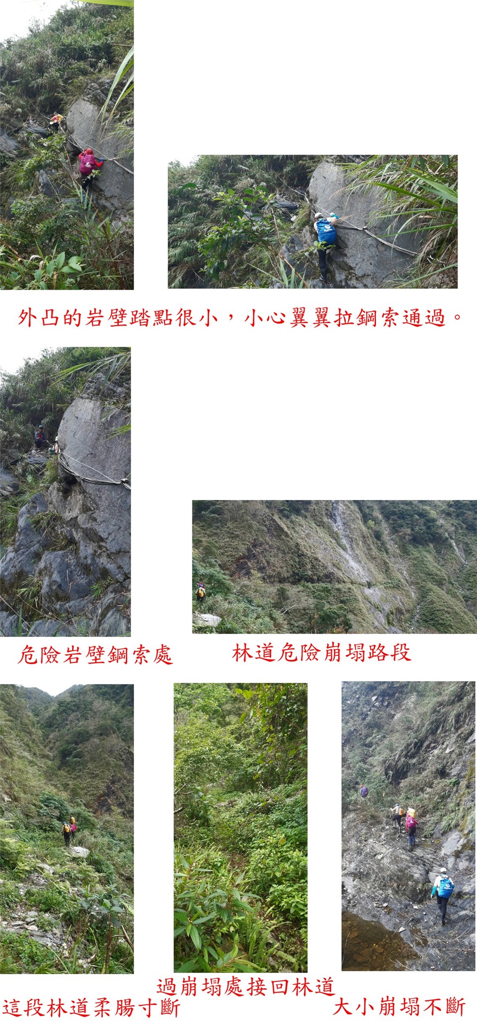 15:10進入危險崩塌區,小心通過突岩鋼索路段與岩壁鐵梯等,回程要乾爽感覺好走多了。