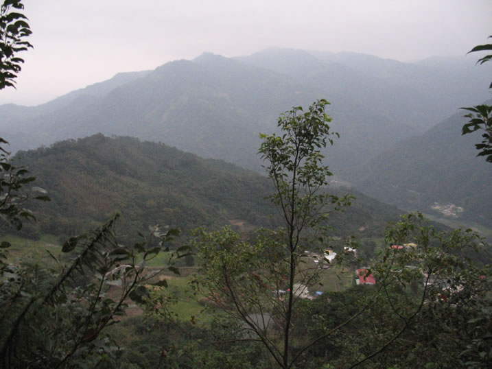 1717 出樹林,視野開濶,遠處下方有部落住家,抬頭仰望對面山頭應是尖筆山、向天湖山連稜,循稜續行。737M