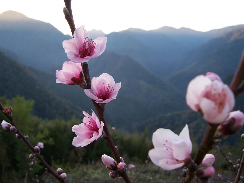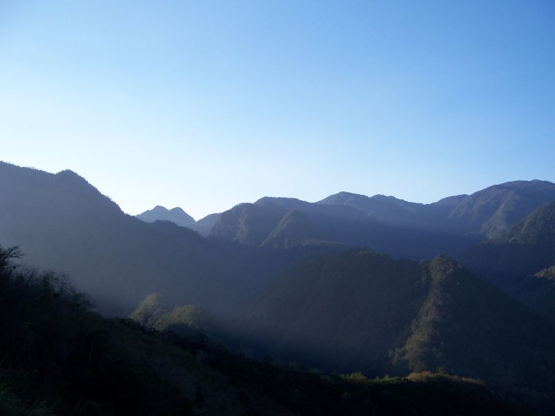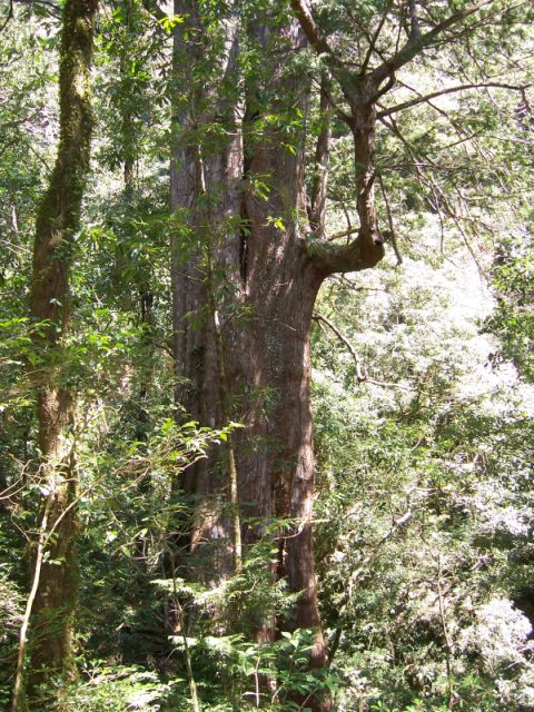 踏入前往神木的山徑出現桃紅, 多美麗說這是欣賞桃花的最佳時節, 滿山遍野, 令人心醉. 右側山巒稜線天際分明, 曙光從峰頂灑落金黃在新光鎮西堡. 途經碎石坡, 這裡是另一賞景的好所在. 經過一陣緩上下後來到神木區, 續沿森林小徑往上, 除原有開放的巨木群, 往上一路原始的巨木一一呈現, 清澄的溪水, 原始的植披, 一般遊客無法欣賞到的自然在這裡靜靜的展現, 多美麗嚮導一路為我們介紹著, 當然休息的時候, 別忘了給我們嚮導該有的回聵.