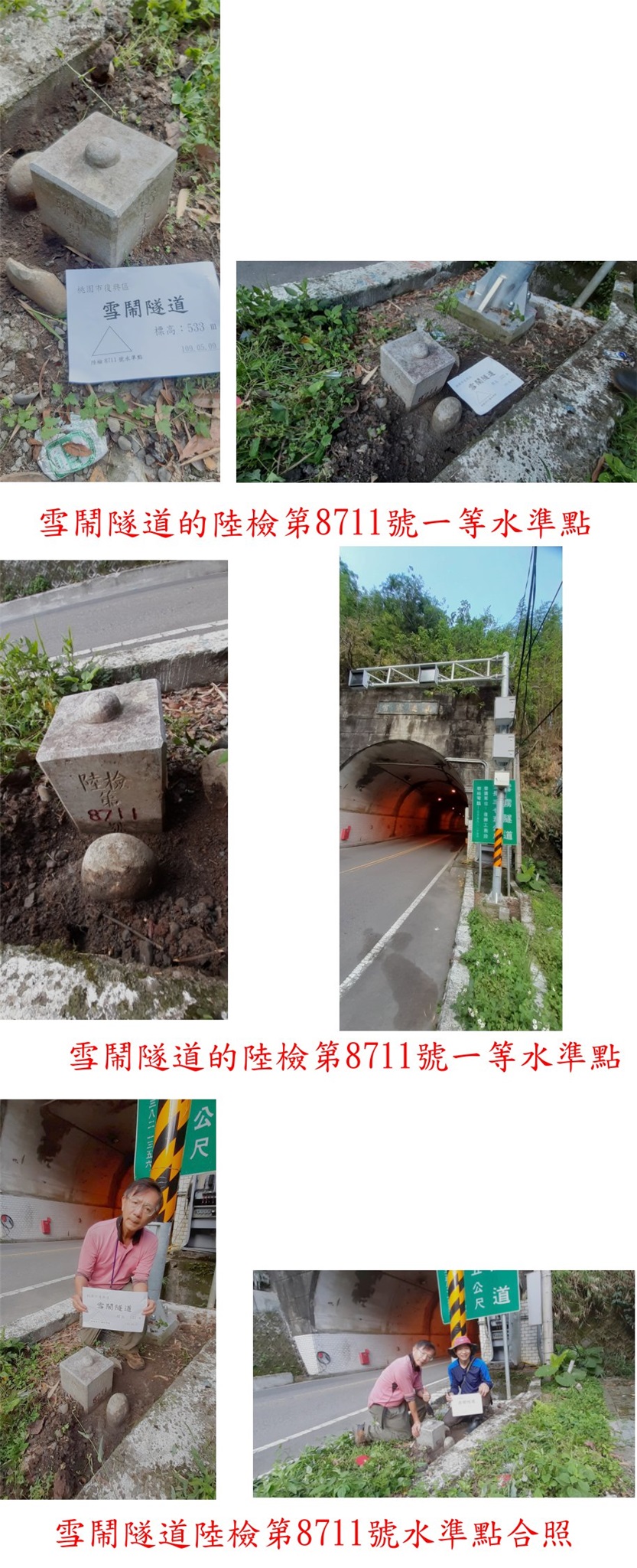 4、雪鬧隧道:位於桃園市復興區,標高541公尺,陸檢一等水準點第8711號基石;座標284520 2737880。