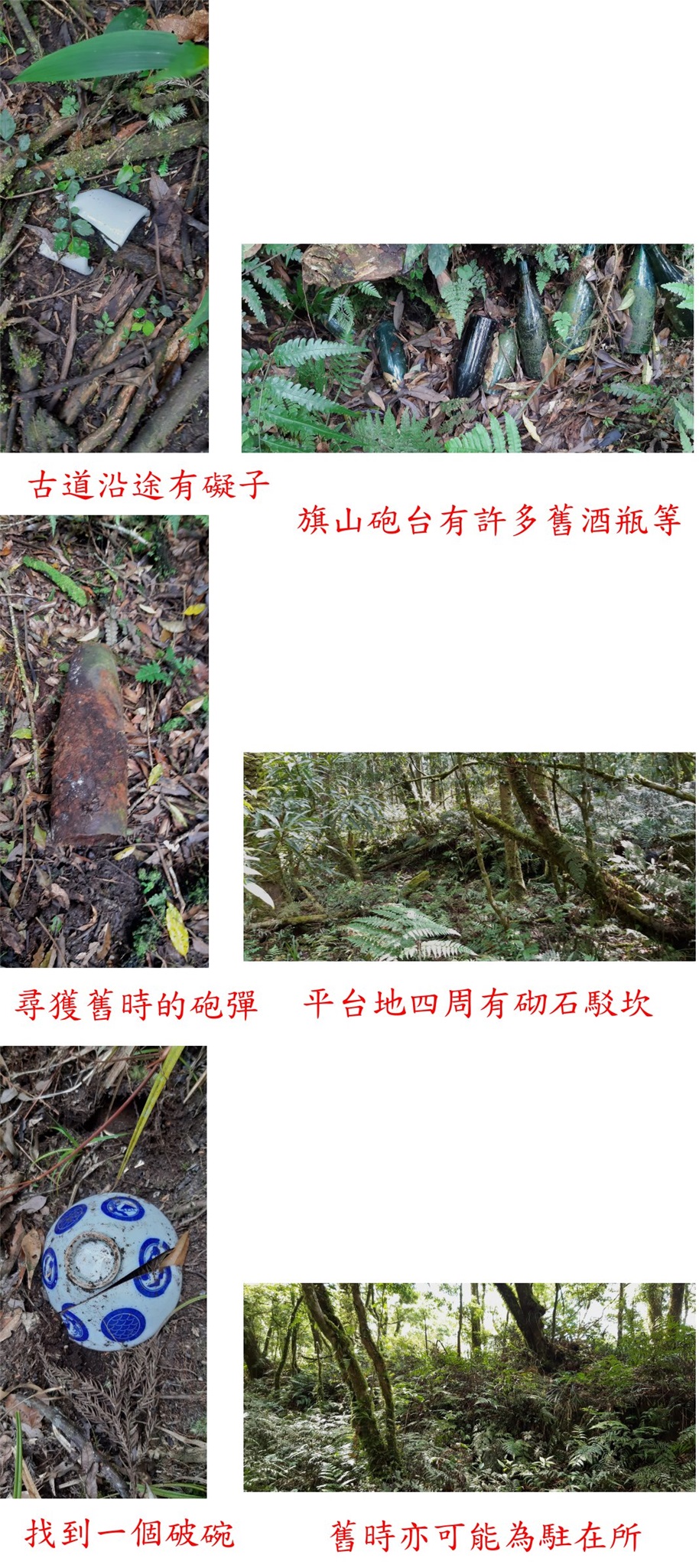 14:24旗山砲台,高1102公尺,平台地四周有砌石駁坎,尋獲舊時的砲彈代表日據時代此處應為砲台,且有許多舊酒瓶等,舊時亦可能為駐在所?此線與梵梵山的古道應是日本人討伐為泰雅族同時修築的,不是專家純屬推測。