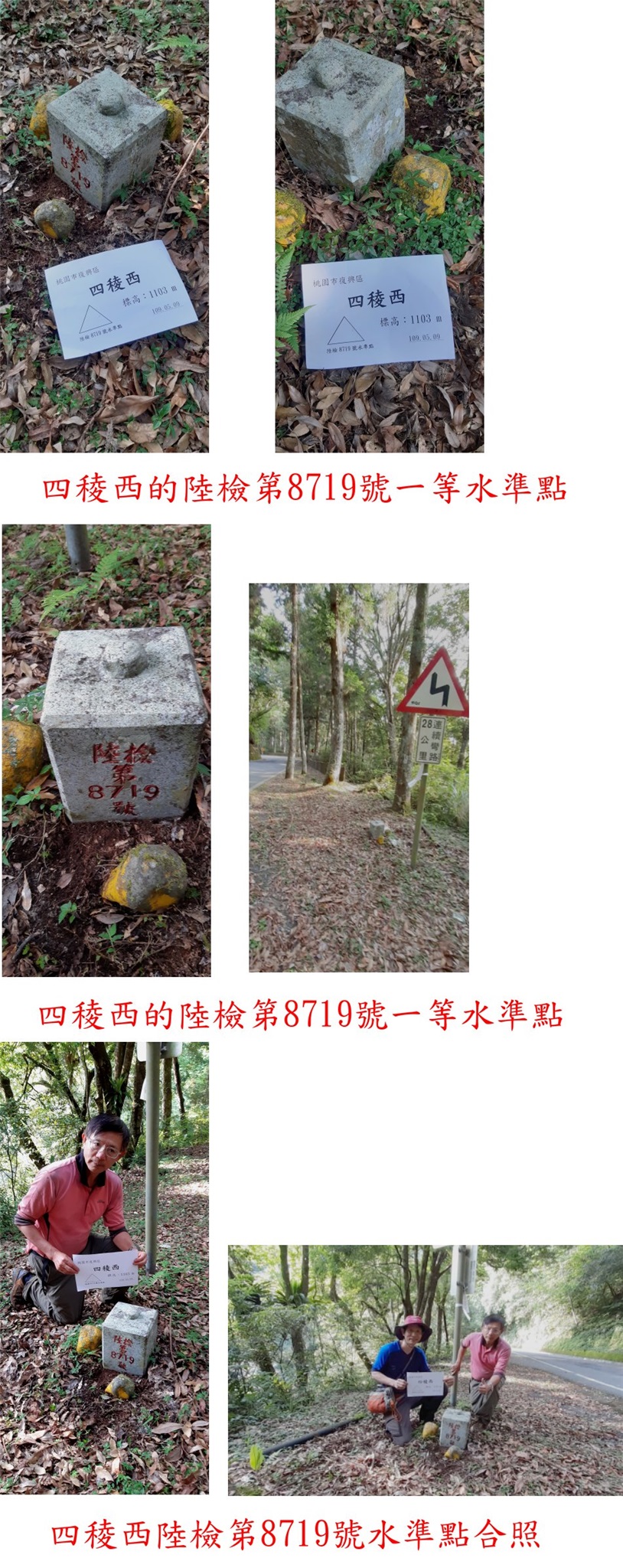 3、四稜西:位於桃園市復興區,標高1122公尺,陸檢一等水準點第8719號基石;座標292092 2727227。