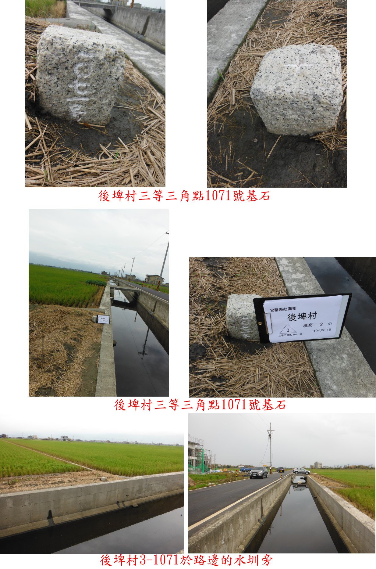 走小橋至水圳的對岸,後埤村3-1071基石於水圳旁靠田地處,明顯好找;此點係由三塊厝的一等原點旁移至現址重立,12年前亦曾來過。