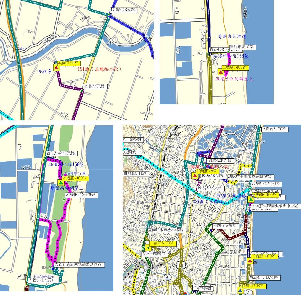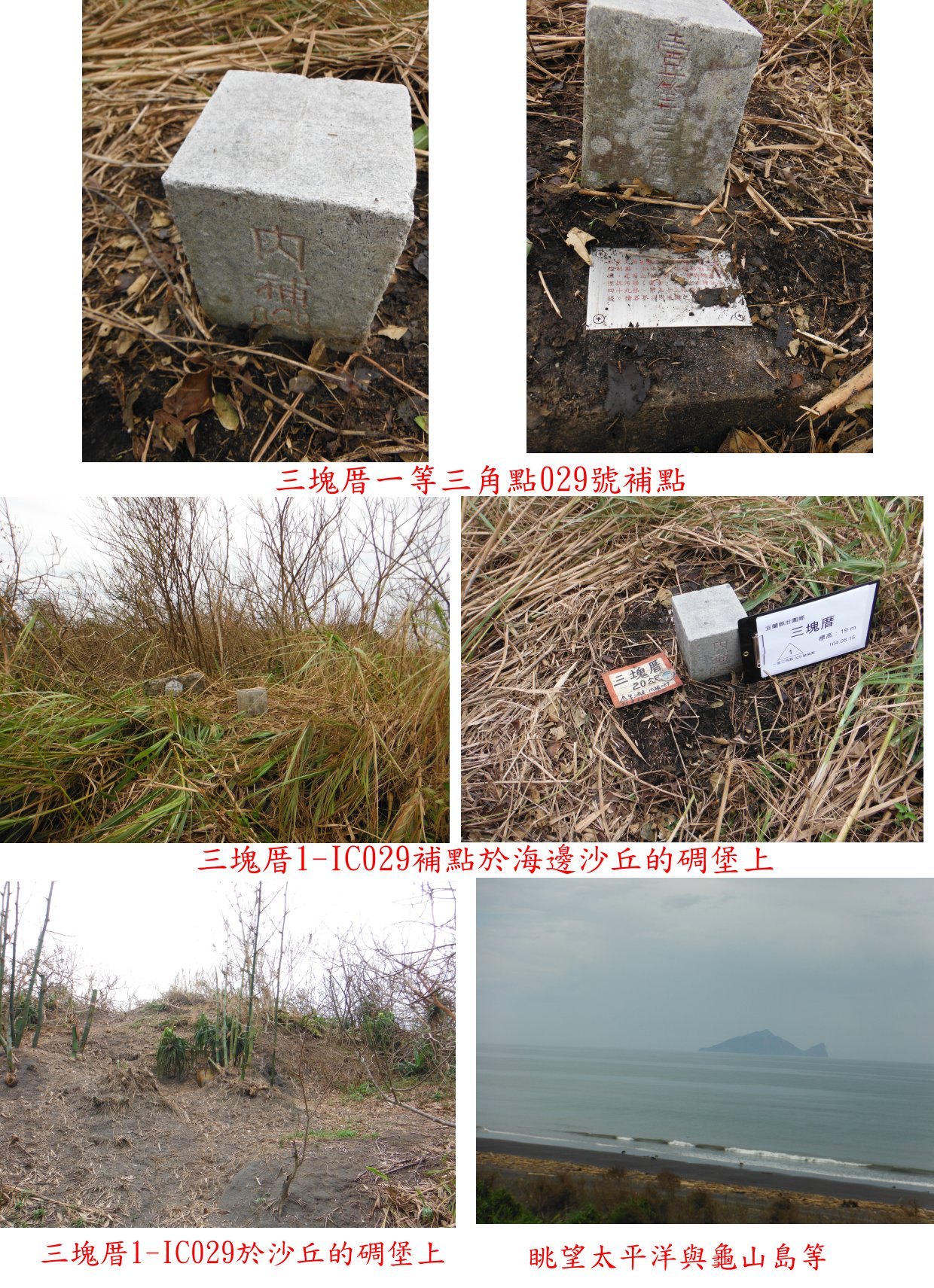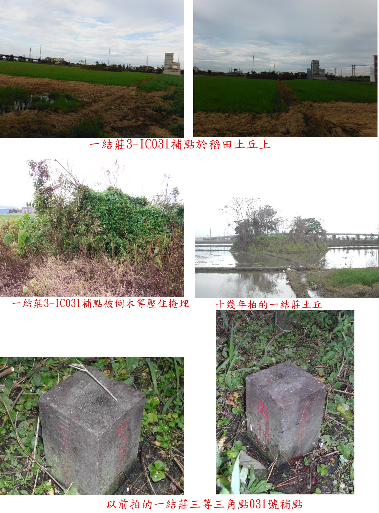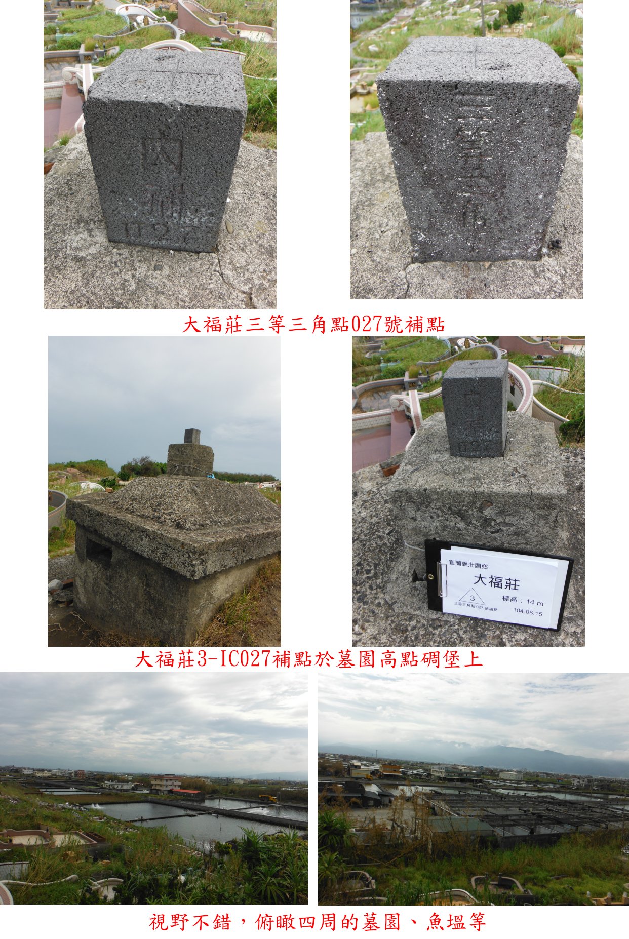 4、大福莊:位於宜蘭縣壯圍鄉,標高14公尺,原點3-1031號遺失,另立三等三角點027號補點。