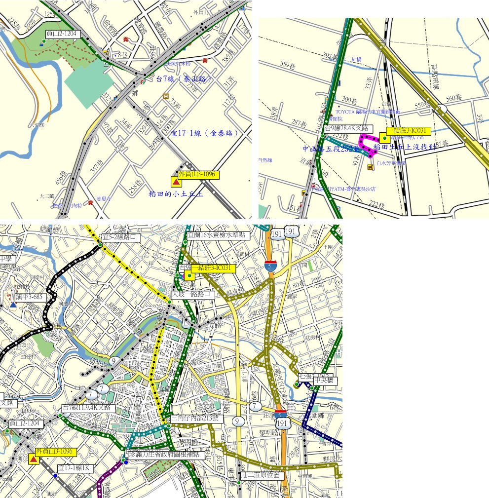 6、一結莊:位於宜蘭市,標高7公尺,原點3-1012遺失,另立三等三角點031號補點。