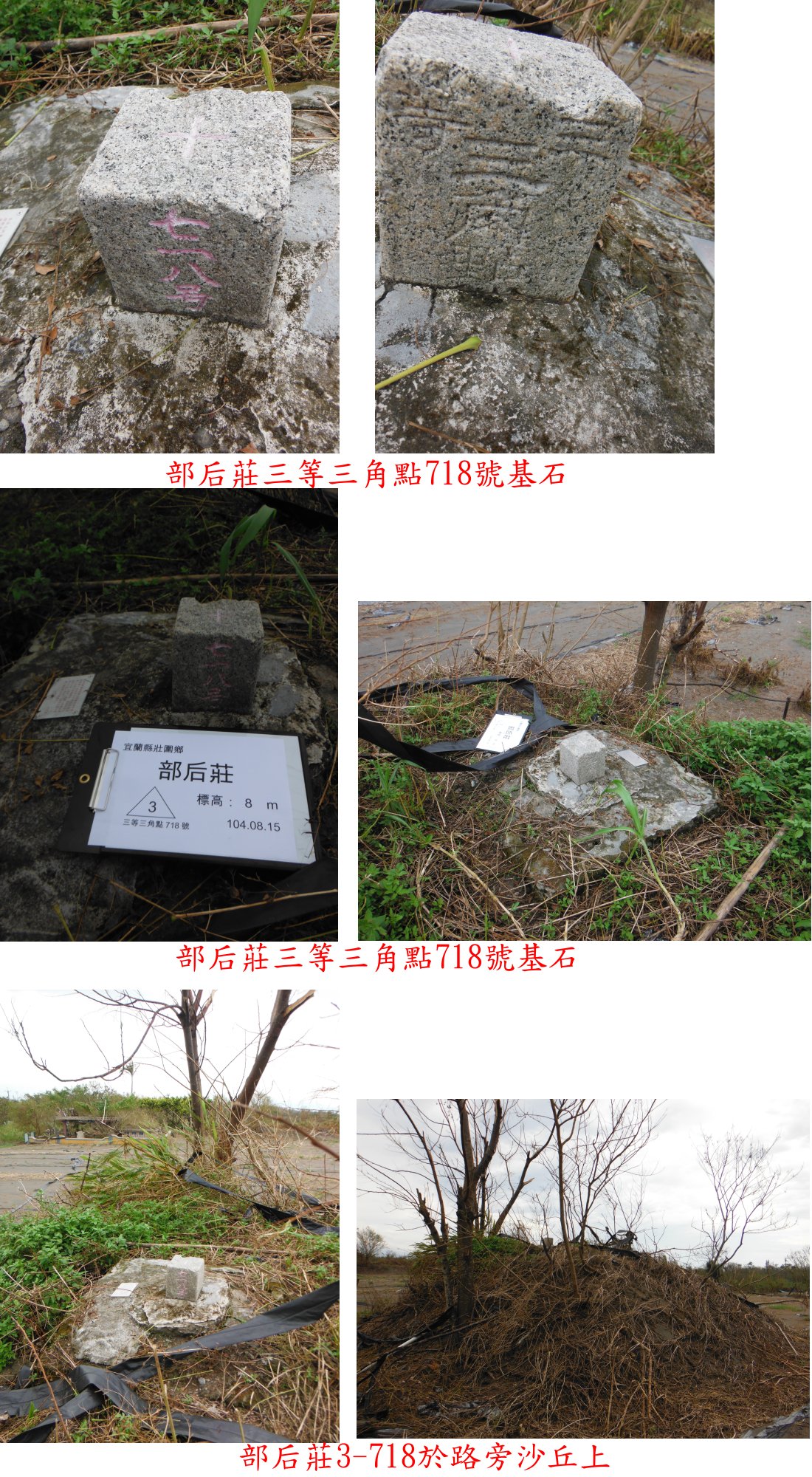 1、部后莊:位於宜蘭縣壯圍鄉,標高8公尺,三等三角點718號基石。