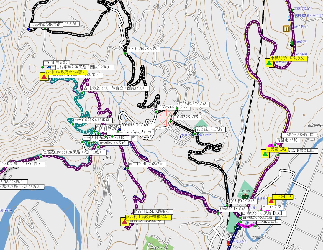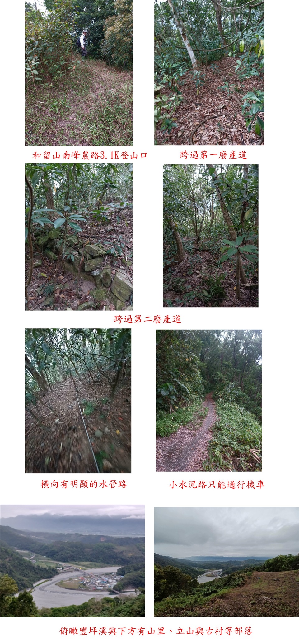 由古村山走西線回到花66線2.9K叉路,左轉花66線至1.9K叉路,取右往西至1.2K立山村叉路,右轉至0.85K叉路,左轉至0.45K叉路,左轉過山里1號橋花0K起點;經山里村落過山里2號橋西端0K起算,產道走0.3K叉路,直行主線往他尾羅等山不取;右轉小水泥路上山至0.6K叉路,取左路窄水泥路之字盤繞往上至1.8K民宅叉路為行車終點,右下方為開墾地,再來只能通行機車;騎機車續盤繞往上,路窄且彎機車小心慢行至3.1K越稜處停車,高