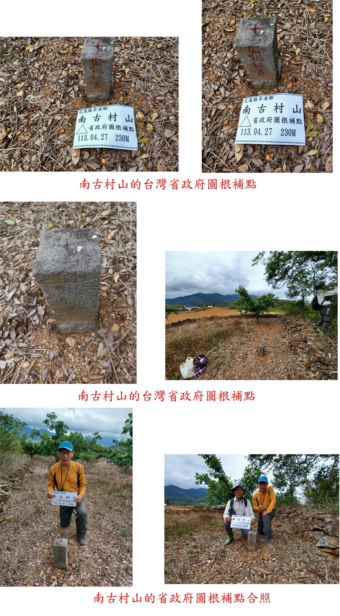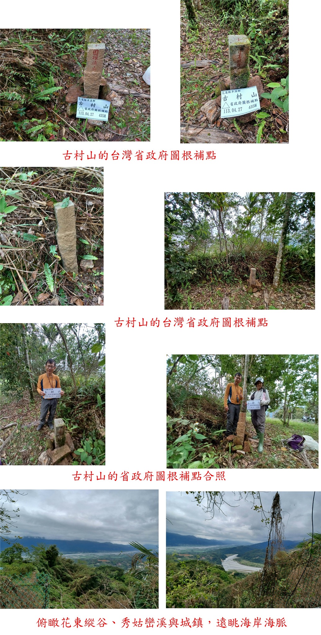 右入開墾地走10餘公尺,即見到古村山的省政府圖根補點,基石被棄置靠在砌石矮牆邊;此點係7777山友新找到的來補,找石頭將基石堆砌起來方便拍照,此點於路旁輕易入袋,附近另有古村山陸IV點但找不到,往返費時約20分鐘;回程改走古村山西線,沿途視野有夠讚,俯瞰花東縱谷、秀姑巒溪與城鎮,遠眺海岸海脈,西線出花66線2.9K叉路。