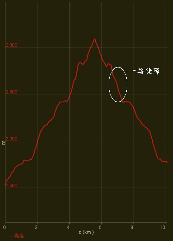 下圖顯示我們下山時,隨著步行的距離,一路從約 2800 公尺的高度下降到 2400左右。並未有上下起伏,或坡度趨緩的現象。