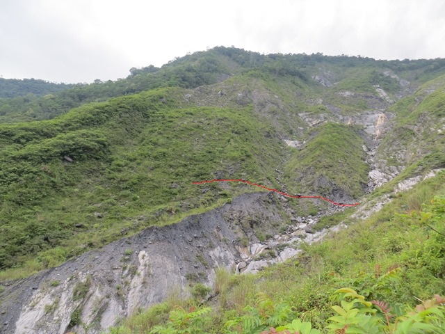 08:21開始崩塌地形、先左橫渡過大崩溝,此處距登山口2K、為舊時停車處附近