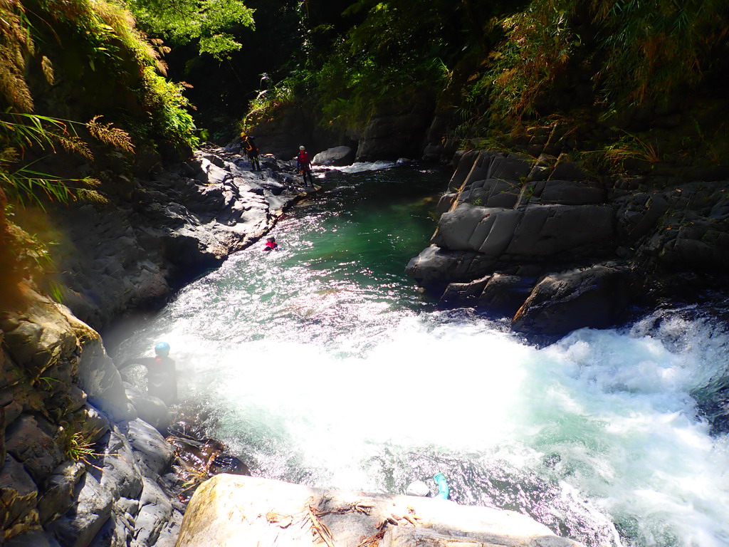 0710 深潭出水口就是石牆谷瀑布,架繩垂降約7~8米輕鬆下去。→