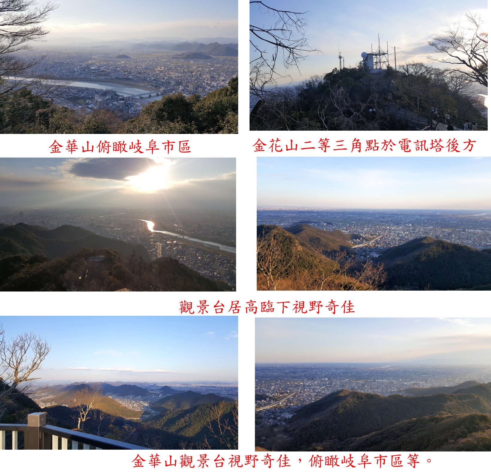 1、金花山:位於日本岐阜県岐阜市,標高328公尺,二等三角點,冠字選点番号為桑;座標N35 26 00.4 E136 4653.4。