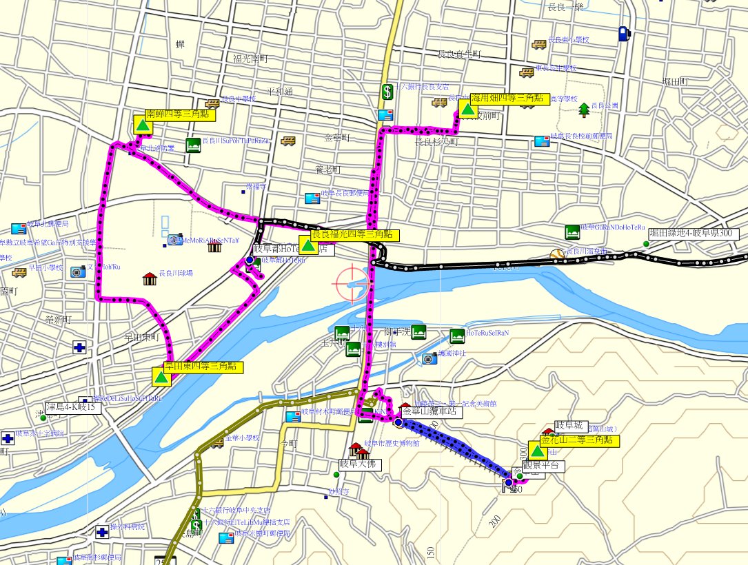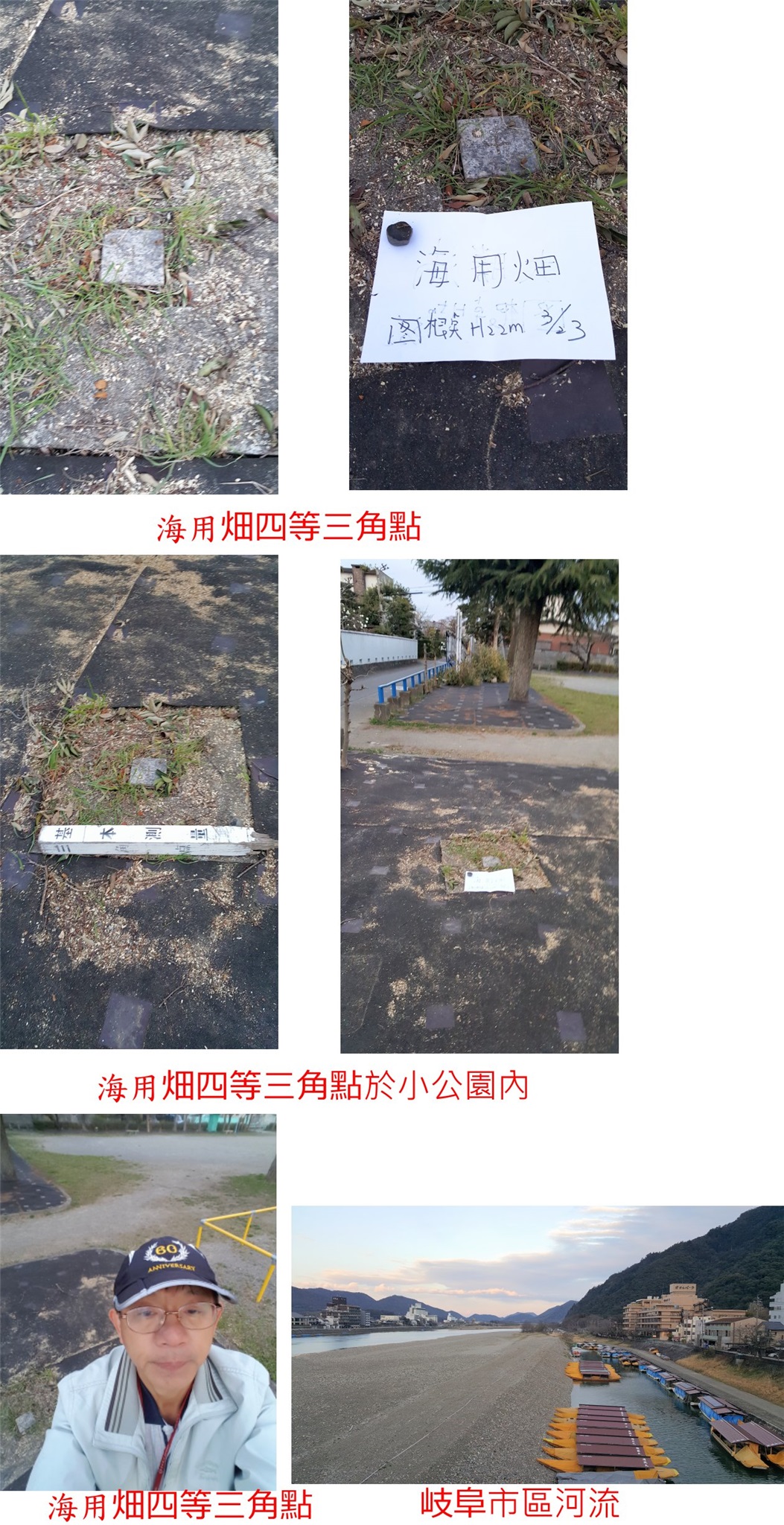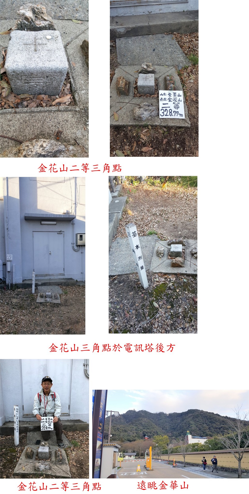 第三天(3/23)行程有安排一等三角點的御在所岳但臨時取消,轉往豋此行第8顆的金花山二等三角點,搭纜車上山走5分鐘即入袋;第9顆的海用畑與第10顆的長良福光的四等三角點,這2顆基石都是補點於岐阜市的市區。