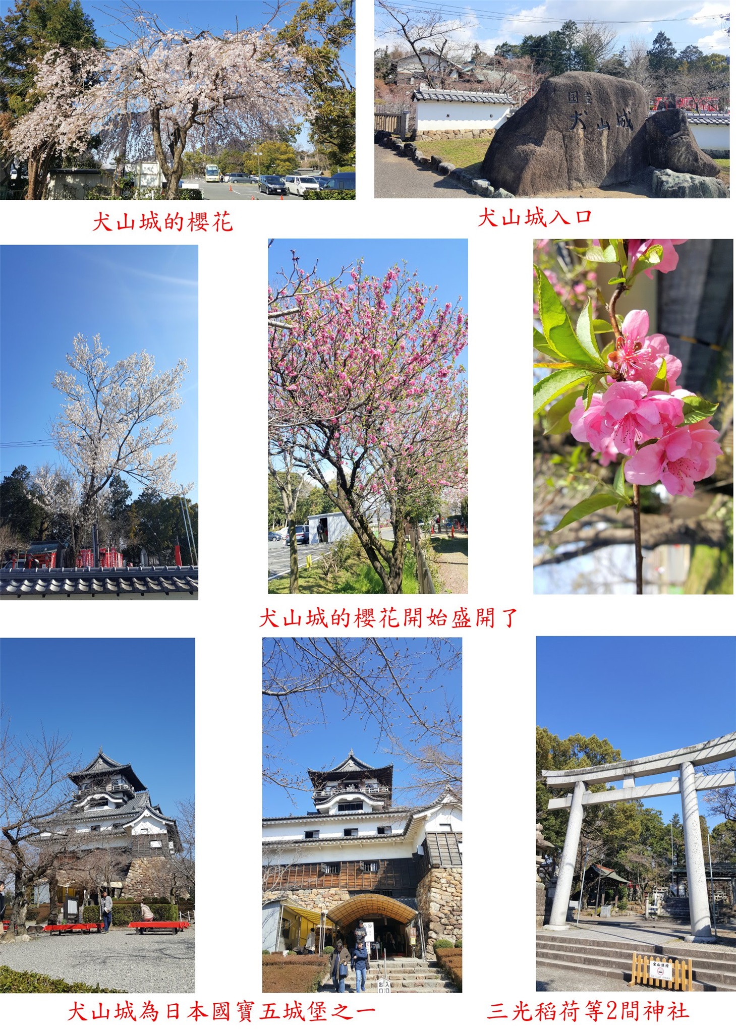 由岐阜都HoTeRu搭遊覽車抵達犬山城參觀,又稱白帝城,為日本國寶五城堡之一,繞一圈並登上古城堡賞景,全方位視野;範圍不太很快就繞一圈,還有點時間去找顆基石,走階梯路下行經三光稻荷等2間神社,接到城堡右側小溪畔的道路往北走